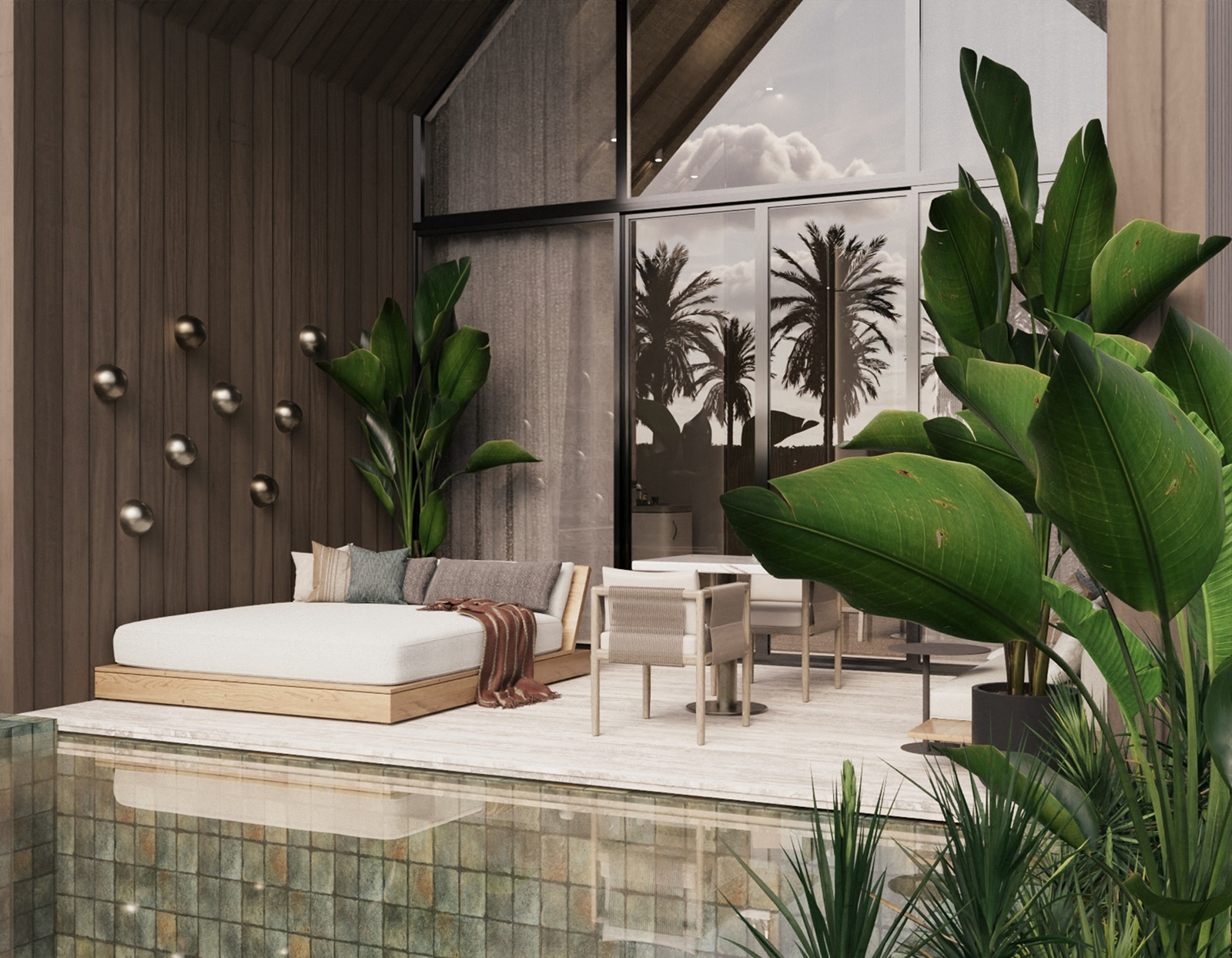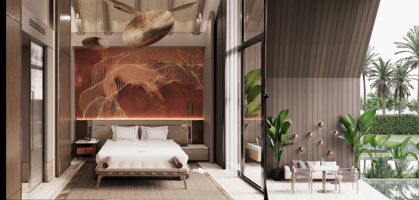 prachtige en nieuwe 1 slpk Lagoon suites (90 m²) in een moderne, strakke en warme stijl met aparte slaapkamer en living, gelegen aan het golfterrein met terras met directe toegang tot het gemeenschappelijke lagune zwembad
