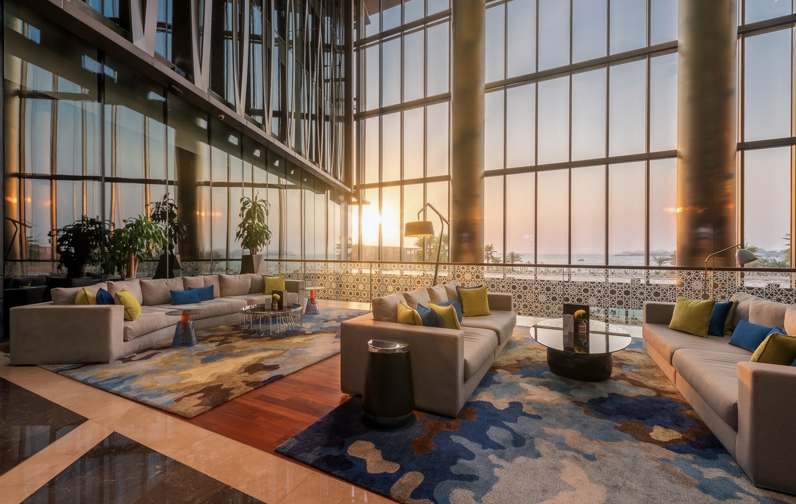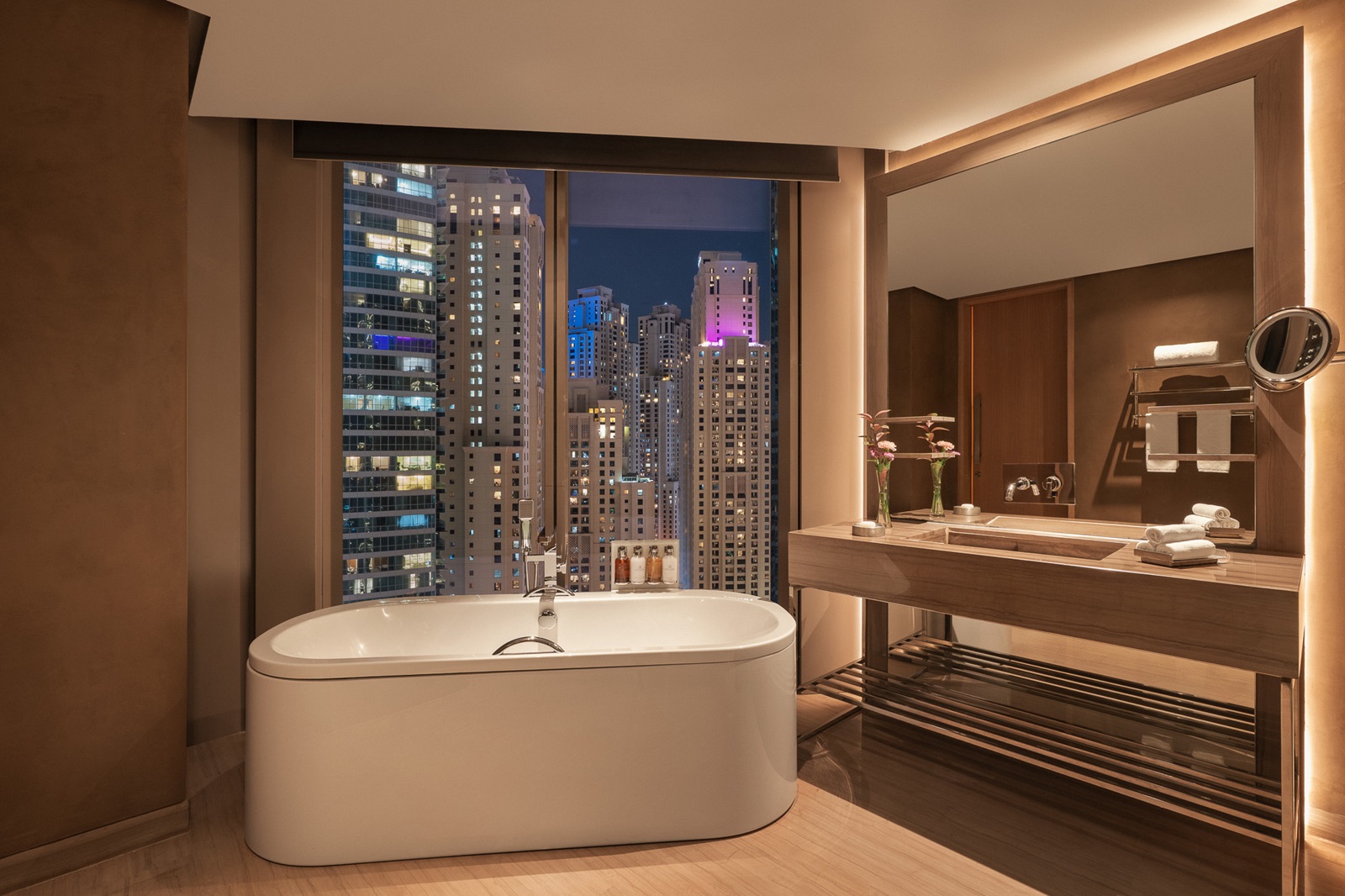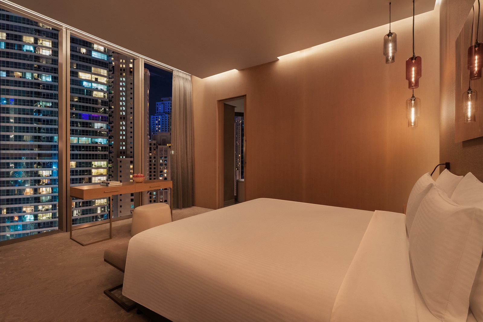 Junior suites (48-53 m²) met ruime woon- en slaapkamer, kingsize bed en zicht over de iconische skyline van JBR