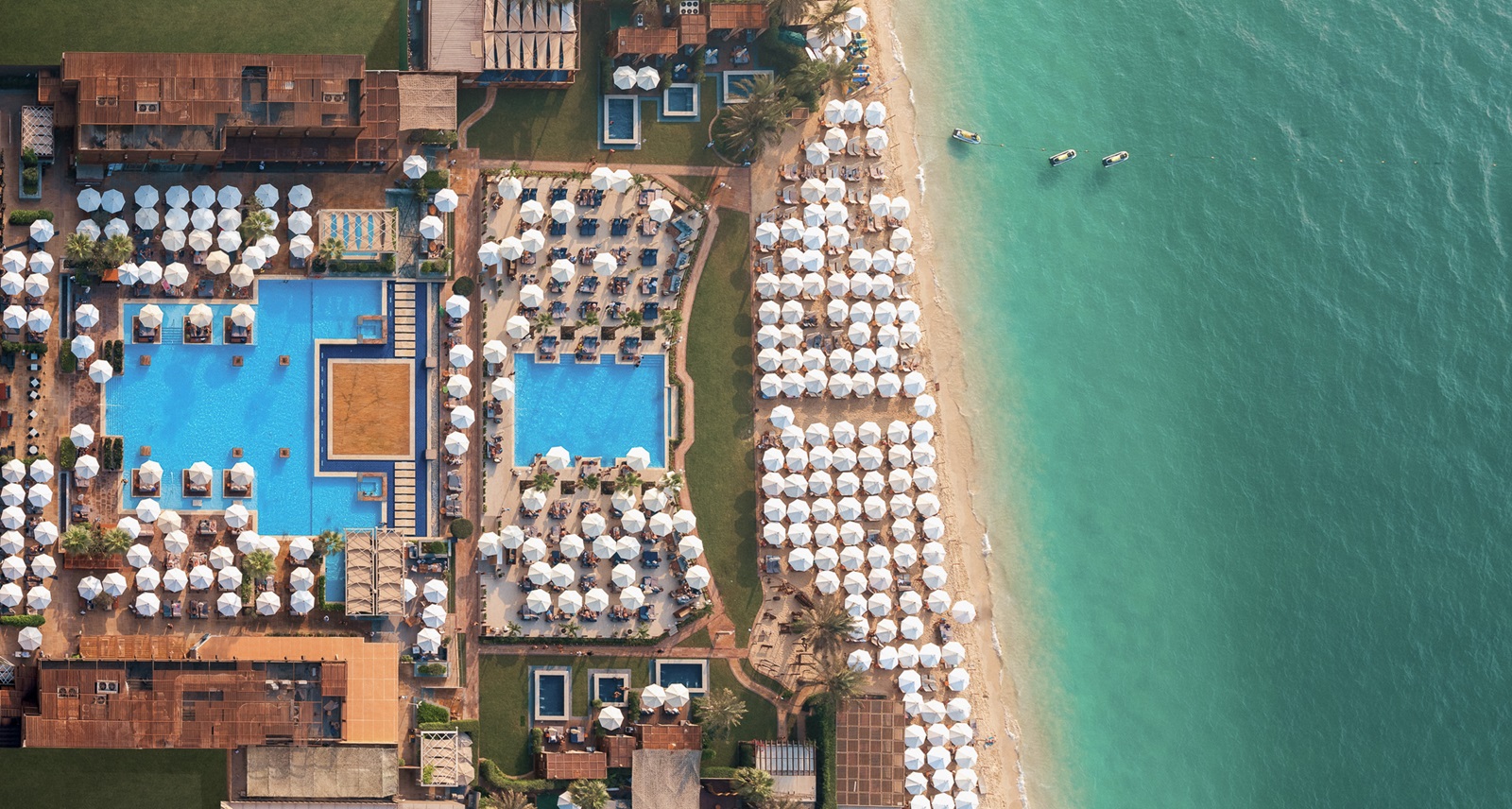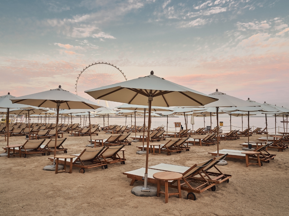 ligbedden, parasols en handdoeken aan het zwembad en het strand