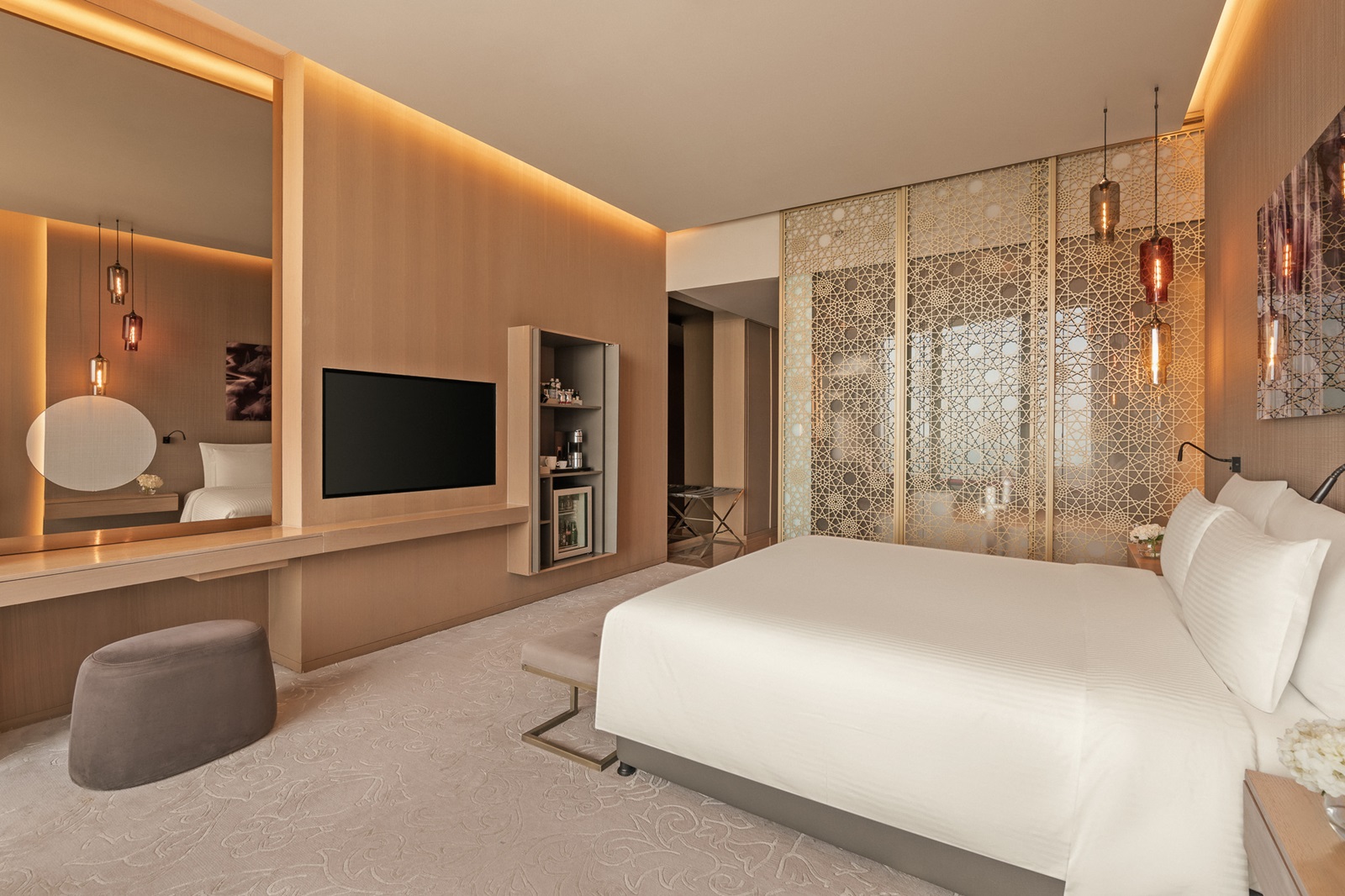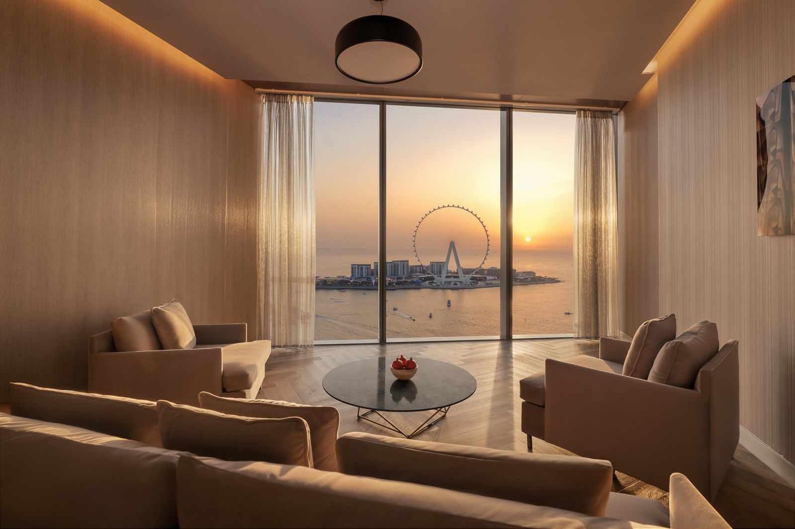 One Bedroom Premium suites (84-94 m²) met ruime woonkamer, aparte slaapkamer met kingsize bed en adembenemend zicht op de Arabische Golf en Ain Dubai