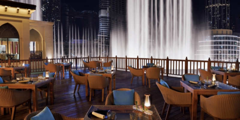 Een van mijn vaste adressen is Thiptara, in het Palace Downtown Hotel. Op het terras dineer je onder de sterren met zicht op de dansende fonteinen en de Burj Khalifa. De combinatie van verfijnde Thaise gerechten en dat uitzicht maakt het tot een van de meest bijzondere plekken van Dubai, gegarandeerd een avond die je niet vergeet.
