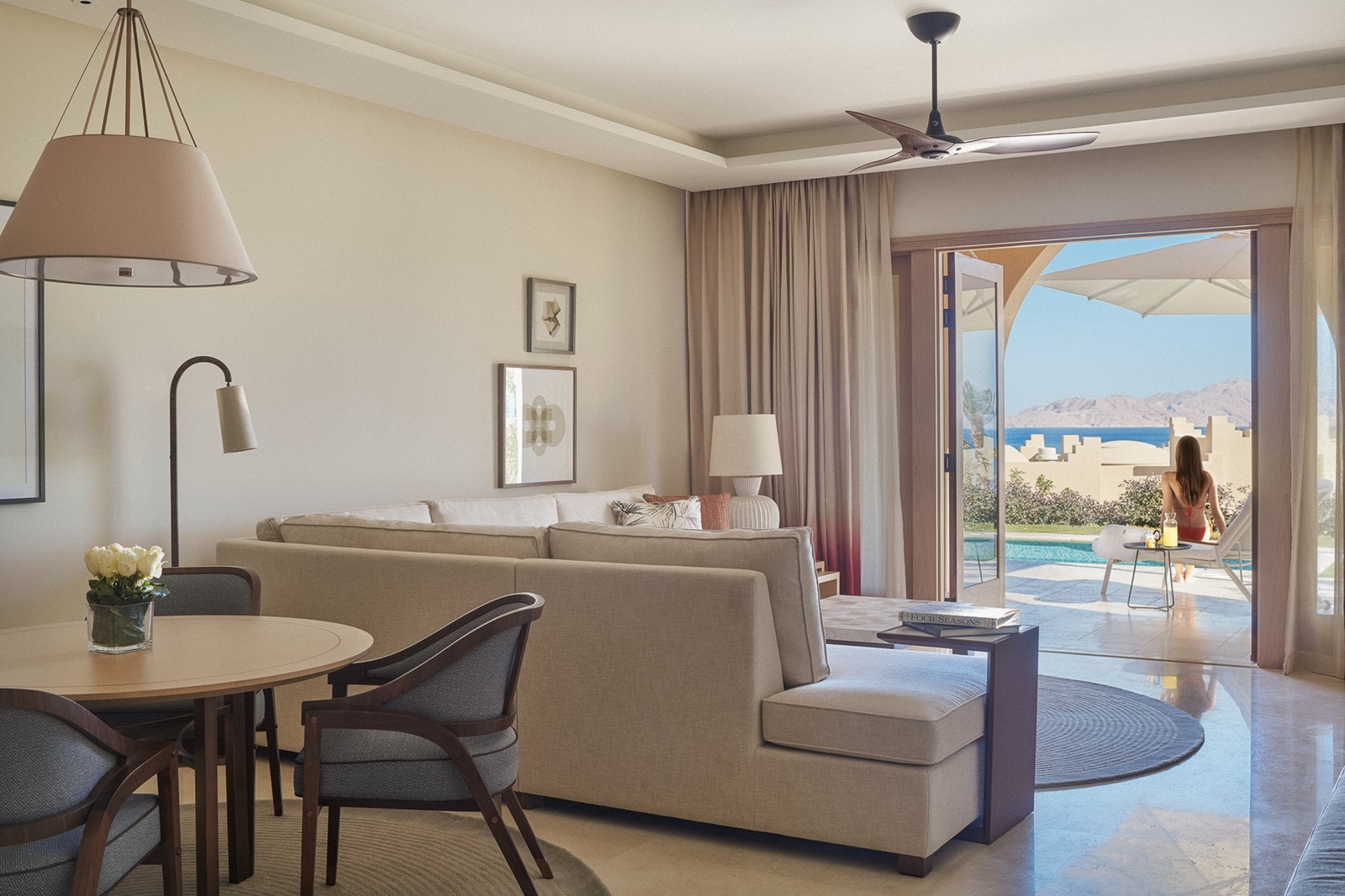 suites (120 m²) met aparte slaapkamer, ruime living, 2de badkamer (met douche) en zeezicht, eveneens mogelijk met privé plonsbad en lateraal zeezicht/tuinzicht