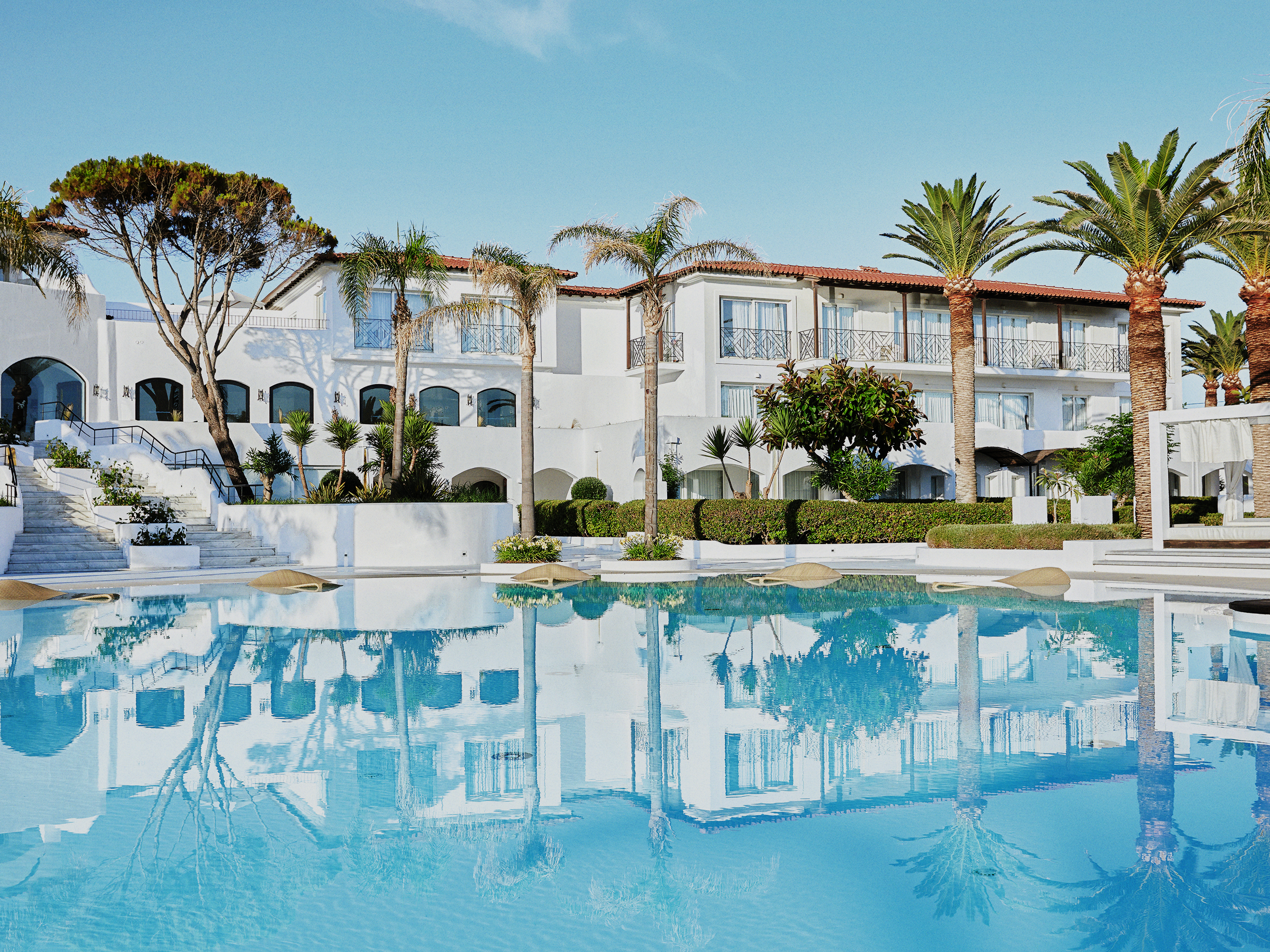 ligbedden, matrasjes, handdoeken en parasols aan zwembad en strand