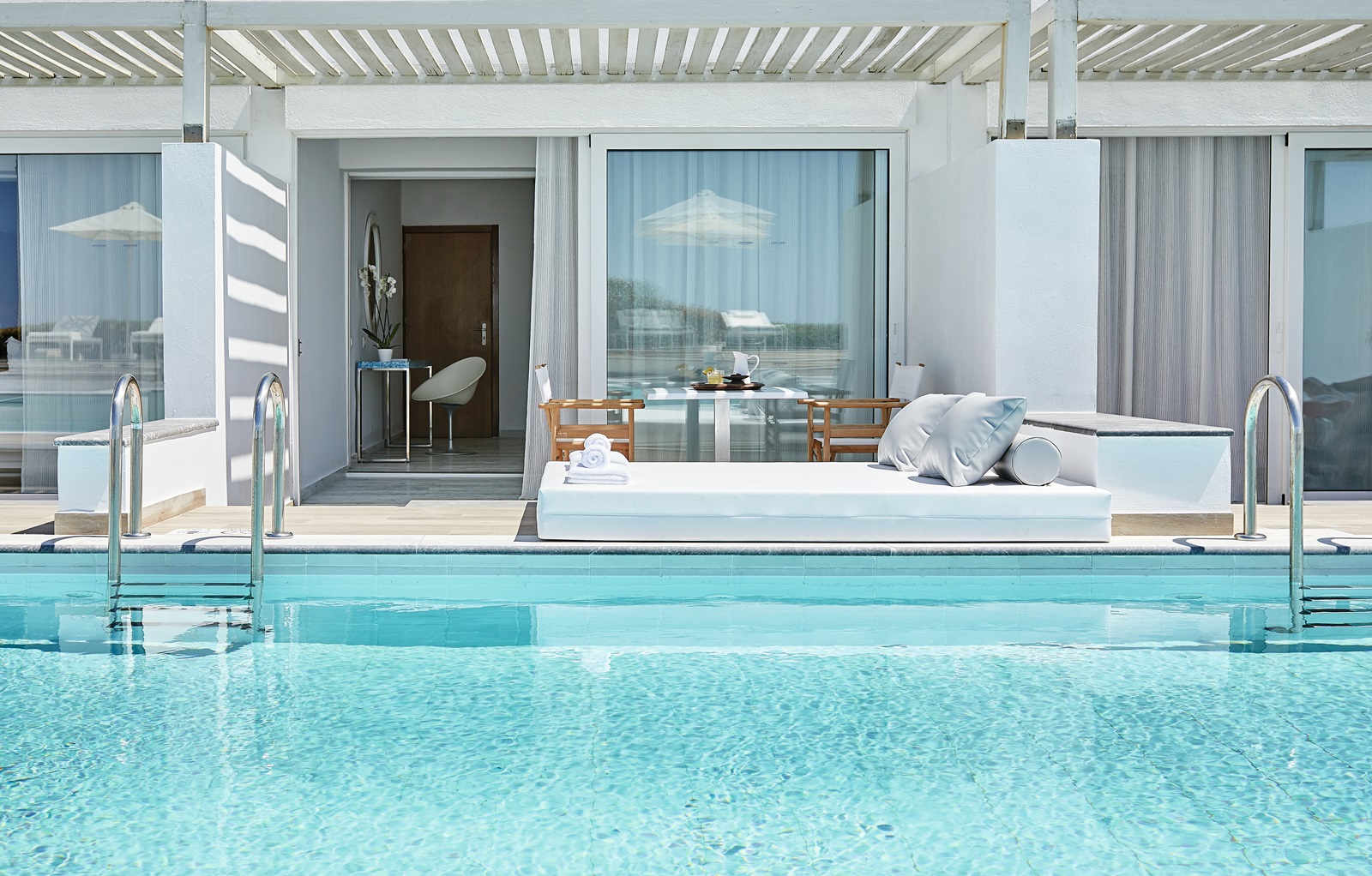 Lux.Me Yali Seafront Suite (54 m²) gelegen aan de zee, met bad en douche, slaapkamer en woonkamer gescheiden door een schuifdeur, terras, directe toegang tot het gedeeld zwembad, tuin met ligbedden