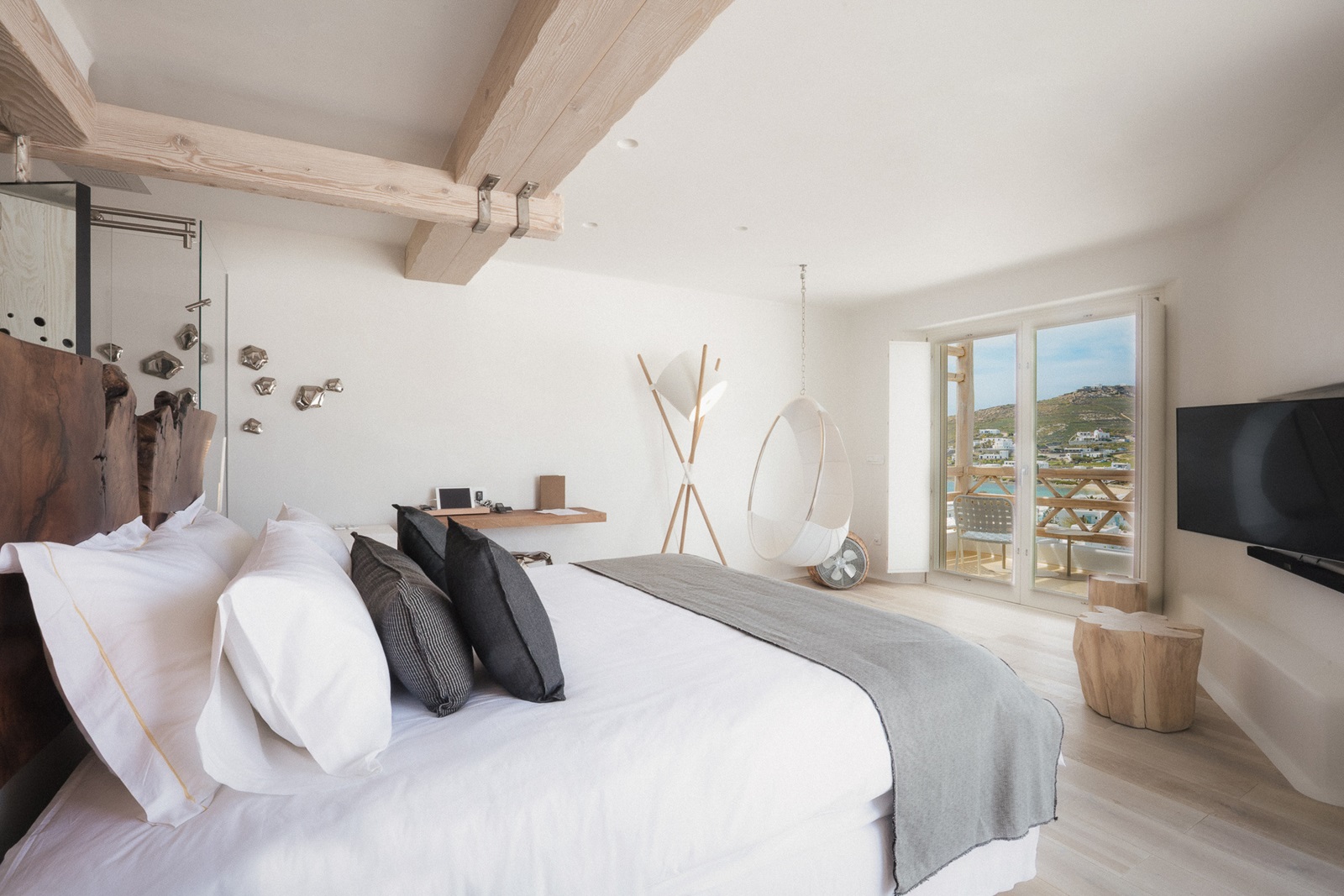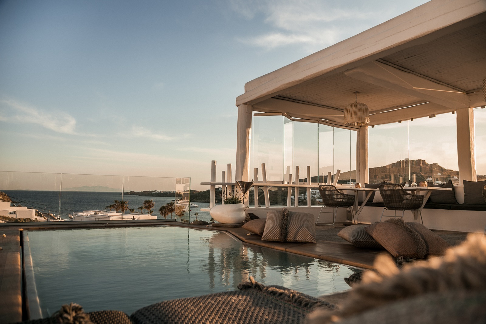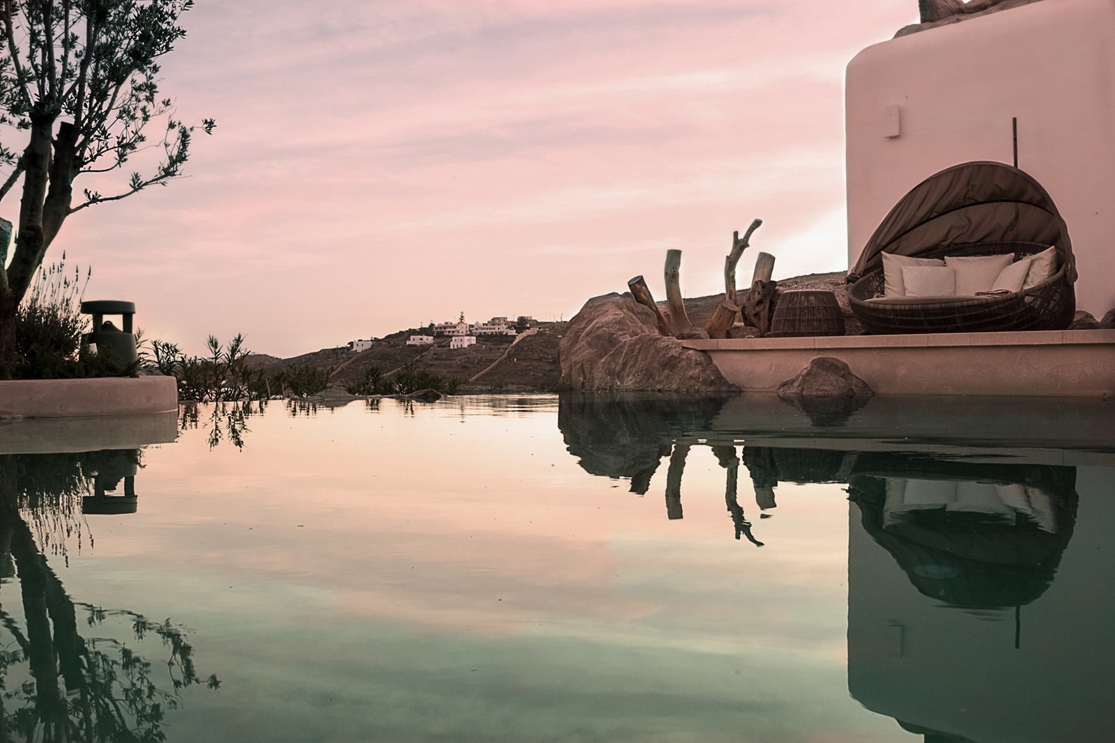 Kove Mykonos is een elegant, kleinschalig hotel met 35 kamers en suites. Het is de ideale plek voor een romantische vakantie met z'n tweetjes. De locatie is alleszins bijzonder: op de top van een heuvel boven het strand van Ornos, met uitzicht over twee baaien. De stijl van het hotel verwijst naar de archetypische witte villa's die kenmerkend zijn voor het eiland. Denk aan witgekalkte muren en natuurstenen vloeren, aangevuld met licht hout, breuksteenmuren en veel moderne kunst en design. In de sfeervolle bar kunt u van 's morgens tot 's avonds terecht voor een cocktail, fingerfood of een diner aan het zwembad.