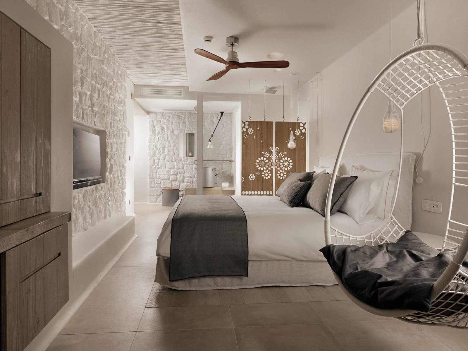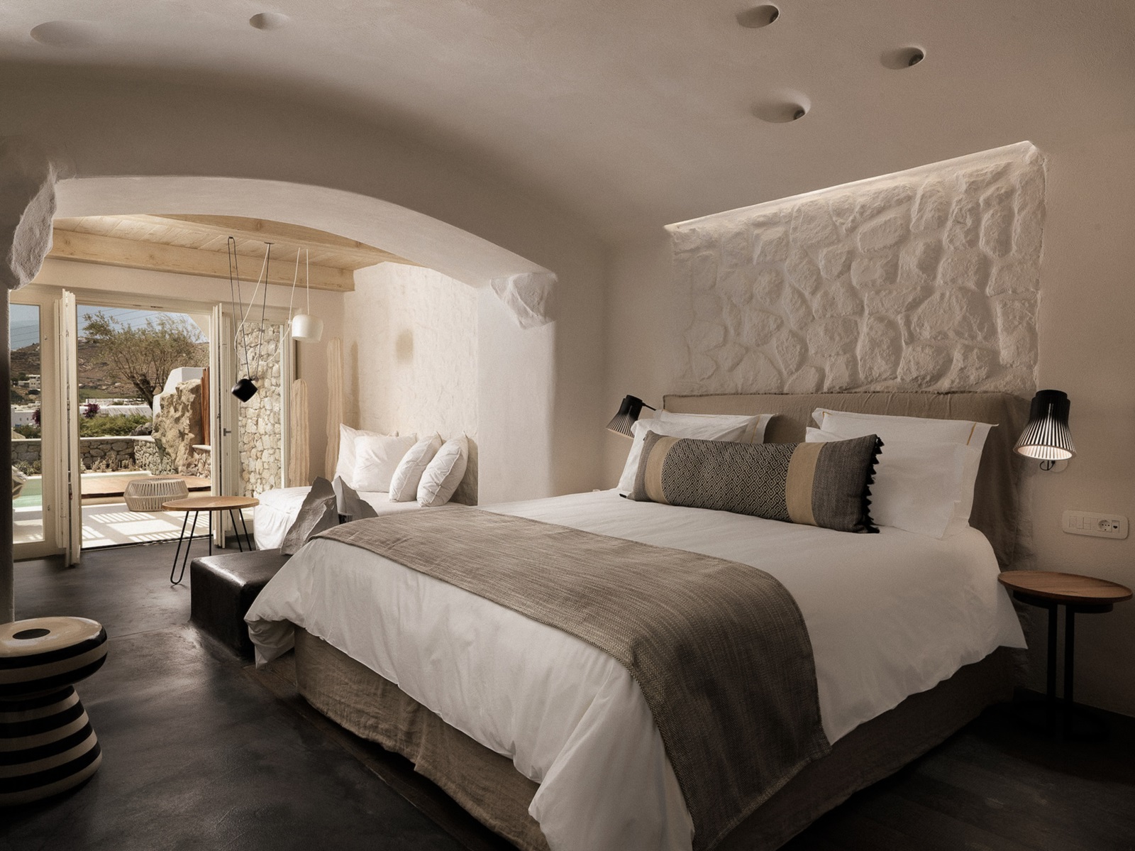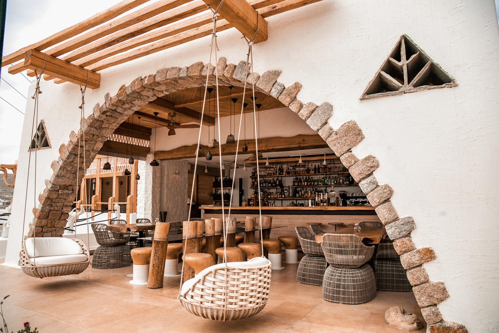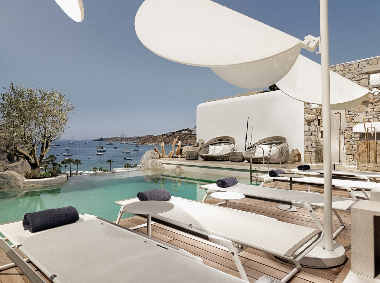 Kove Mykonos is een elegant, kleinschalig hotel met 35 kamers en suites. Het is de ideale plek voor een romantische vakantie met z'n tweetjes. De locatie is alleszins bijzonder: op de top van een heuvel boven het strand van Ornos, met uitzicht over twee baaien. De stijl van het hotel verwijst naar de archetypische witte villa's die kenmerkend zijn voor het eiland. Denk aan witgekalkte muren en natuurstenen vloeren, aangevuld met licht hout, breuksteenmuren en veel moderne kunst en design. In de sfeervolle bar kunt u van 's morgens tot 's avonds terecht voor een cocktail, fingerfood of een diner aan het zwembad.