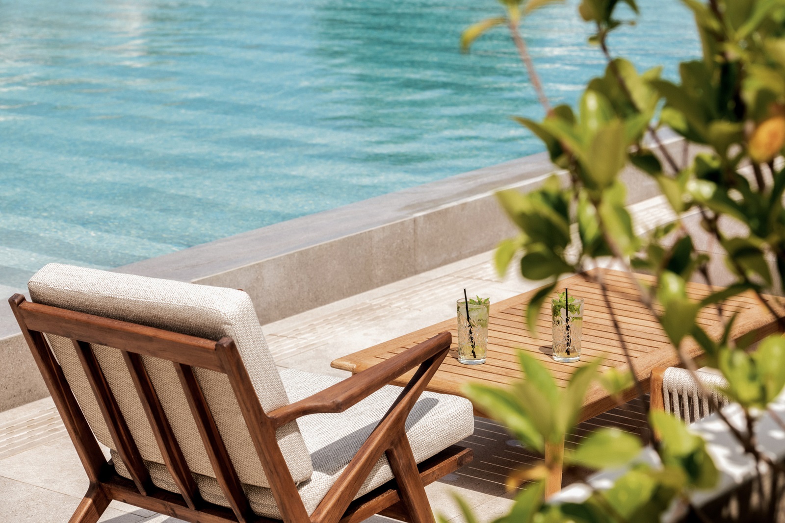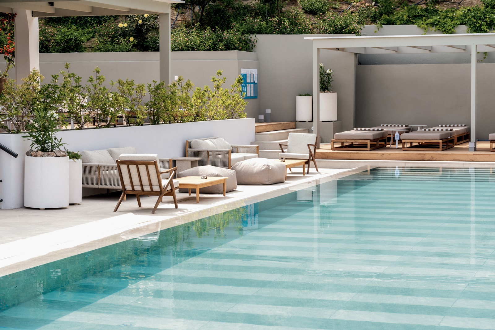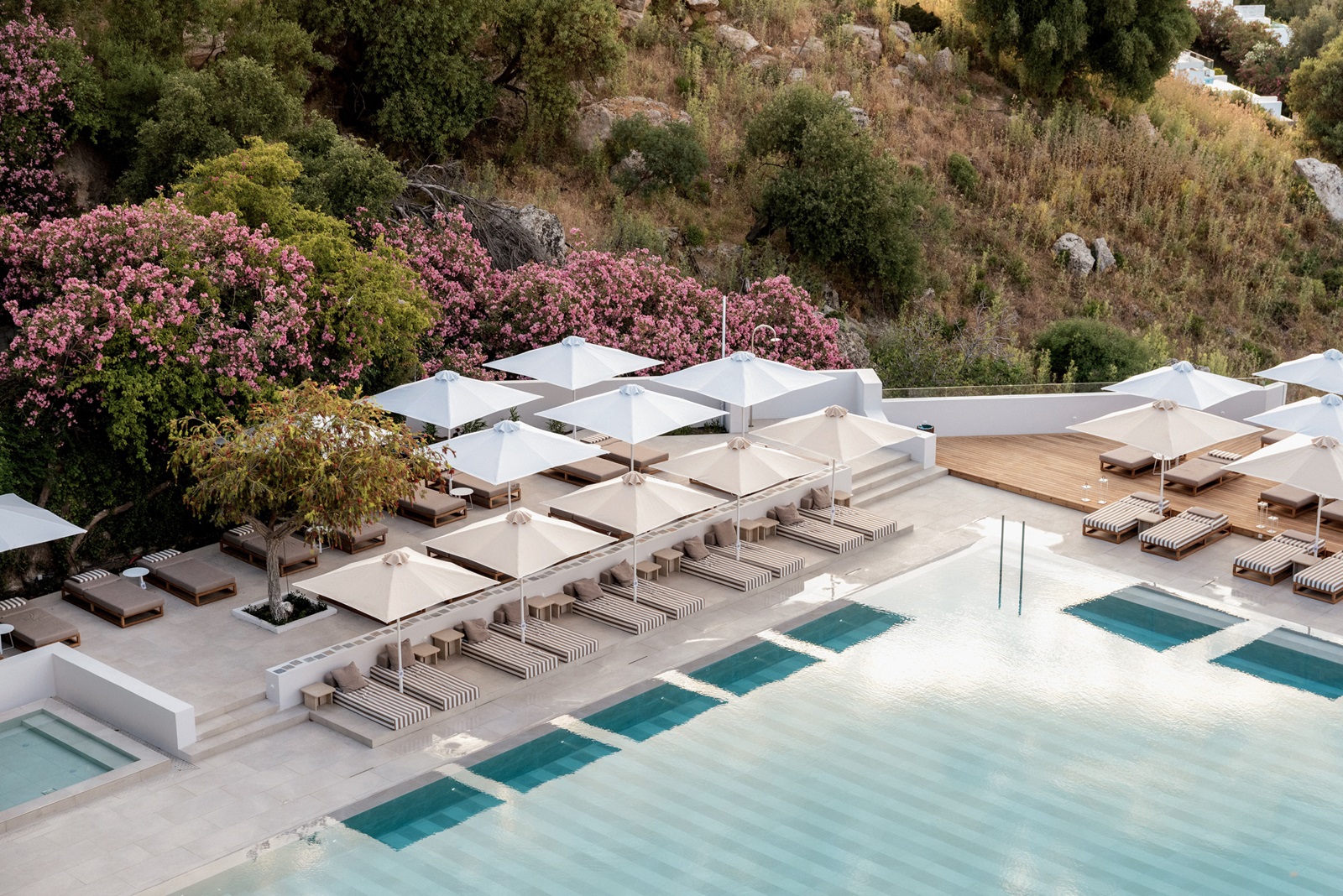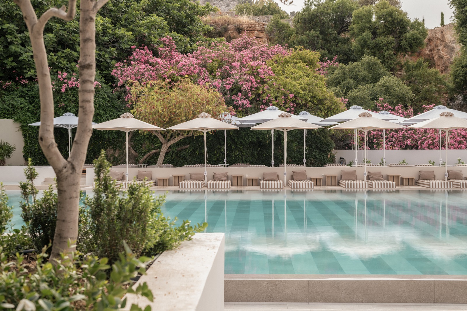 ligbedden, matrasjes, parasols en handdoeken aan het zwembad en strand