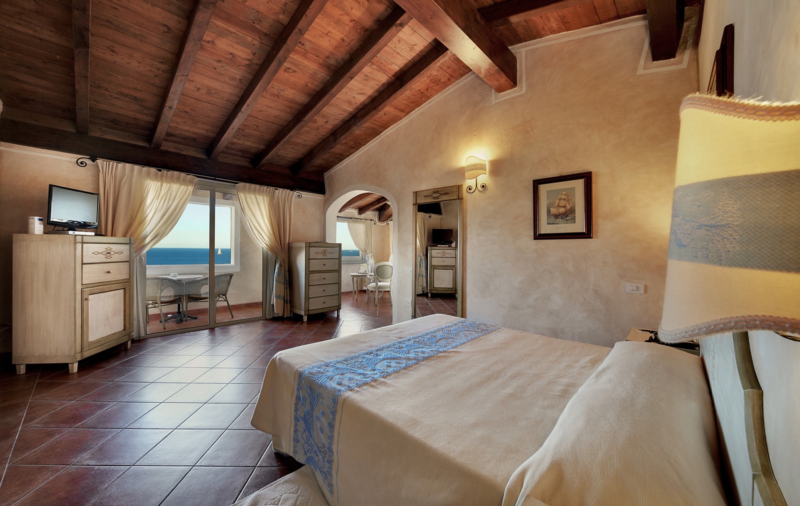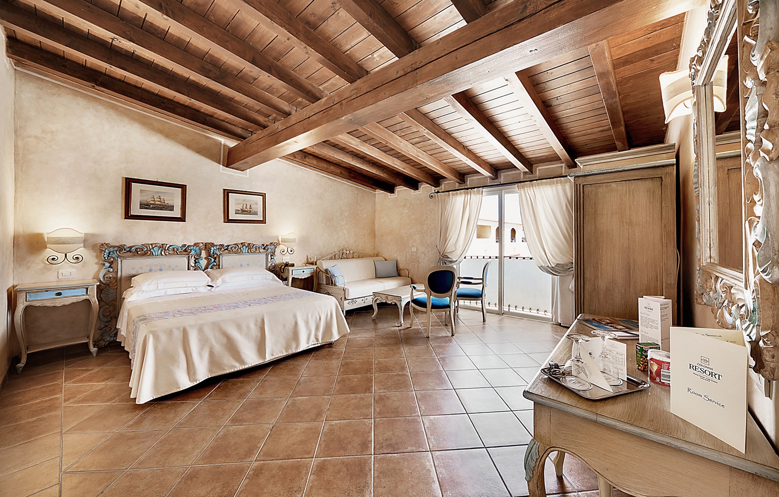 alle klassiek ingerichte kamers in Sardische stijl met typische tegelvloer hebben een badkamer (bad/douche, haardroger), flatscreen-tv, telefoon, wifi (gratis), minibar (€), kluisje, airconditioning en balkon of terras
