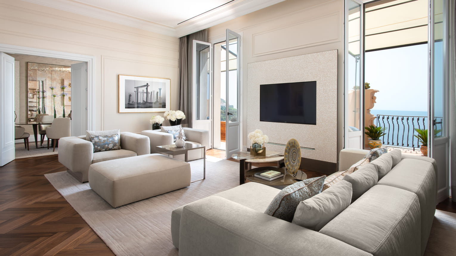 Presidential Suite (ca. 100 m²) – ruime living, slaapkamer, eetruimte en panoramisch terras; butlerservice op aanvraag