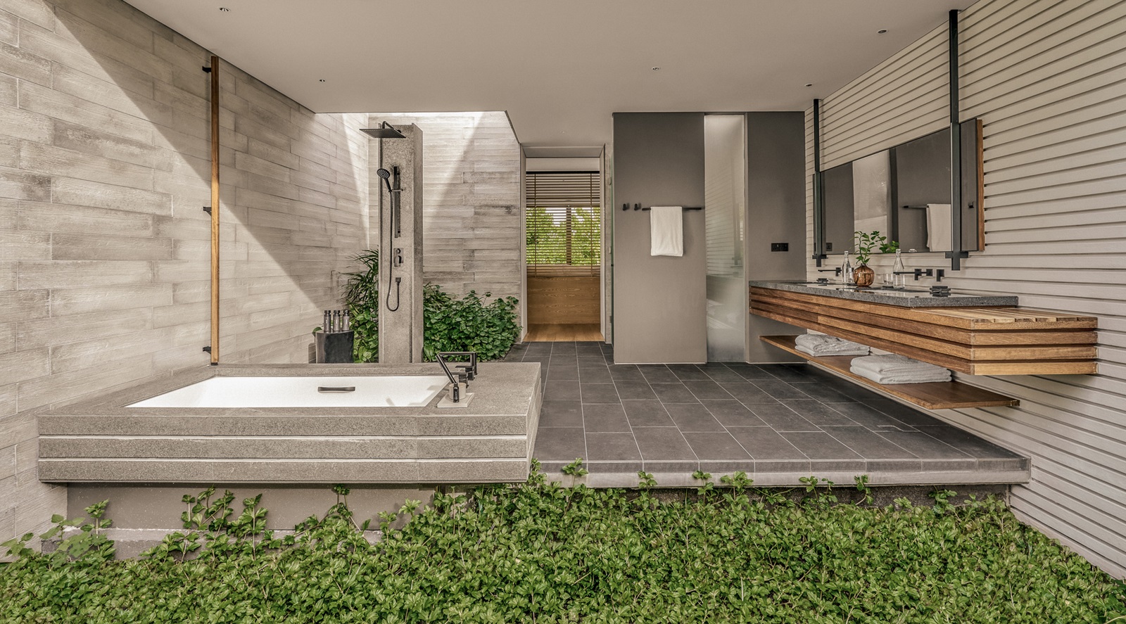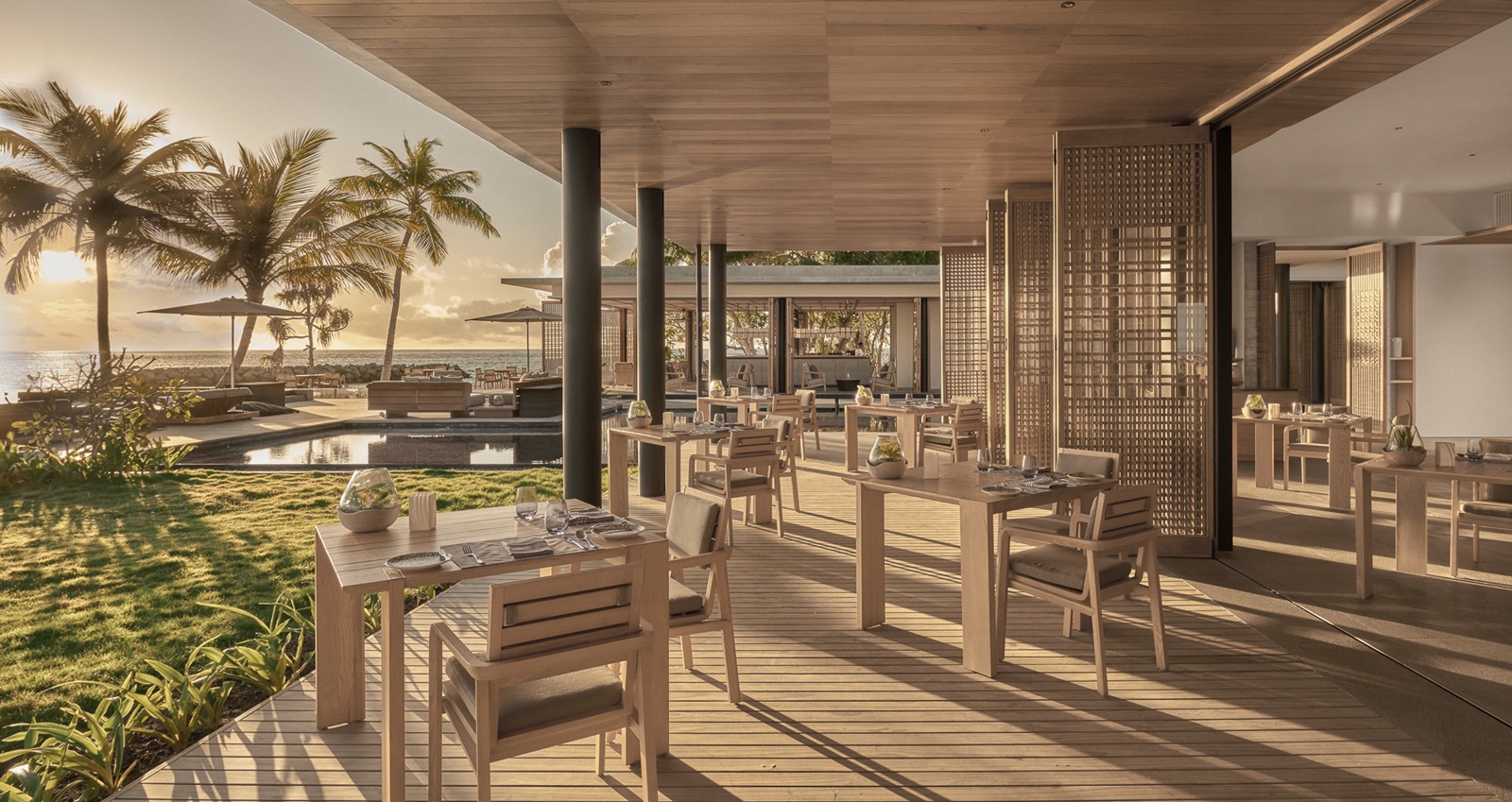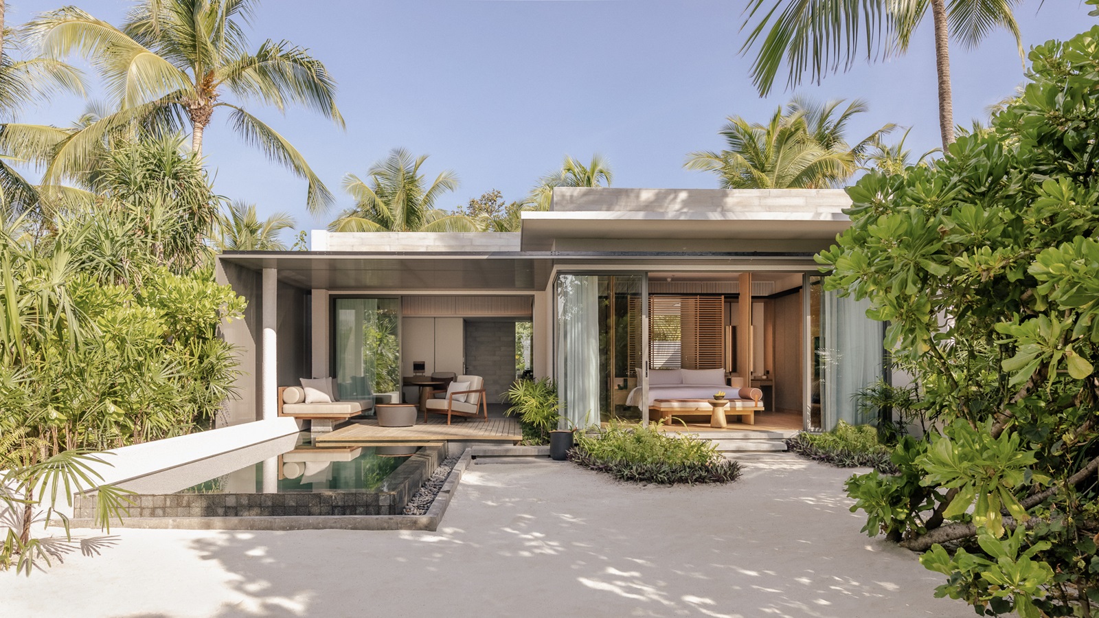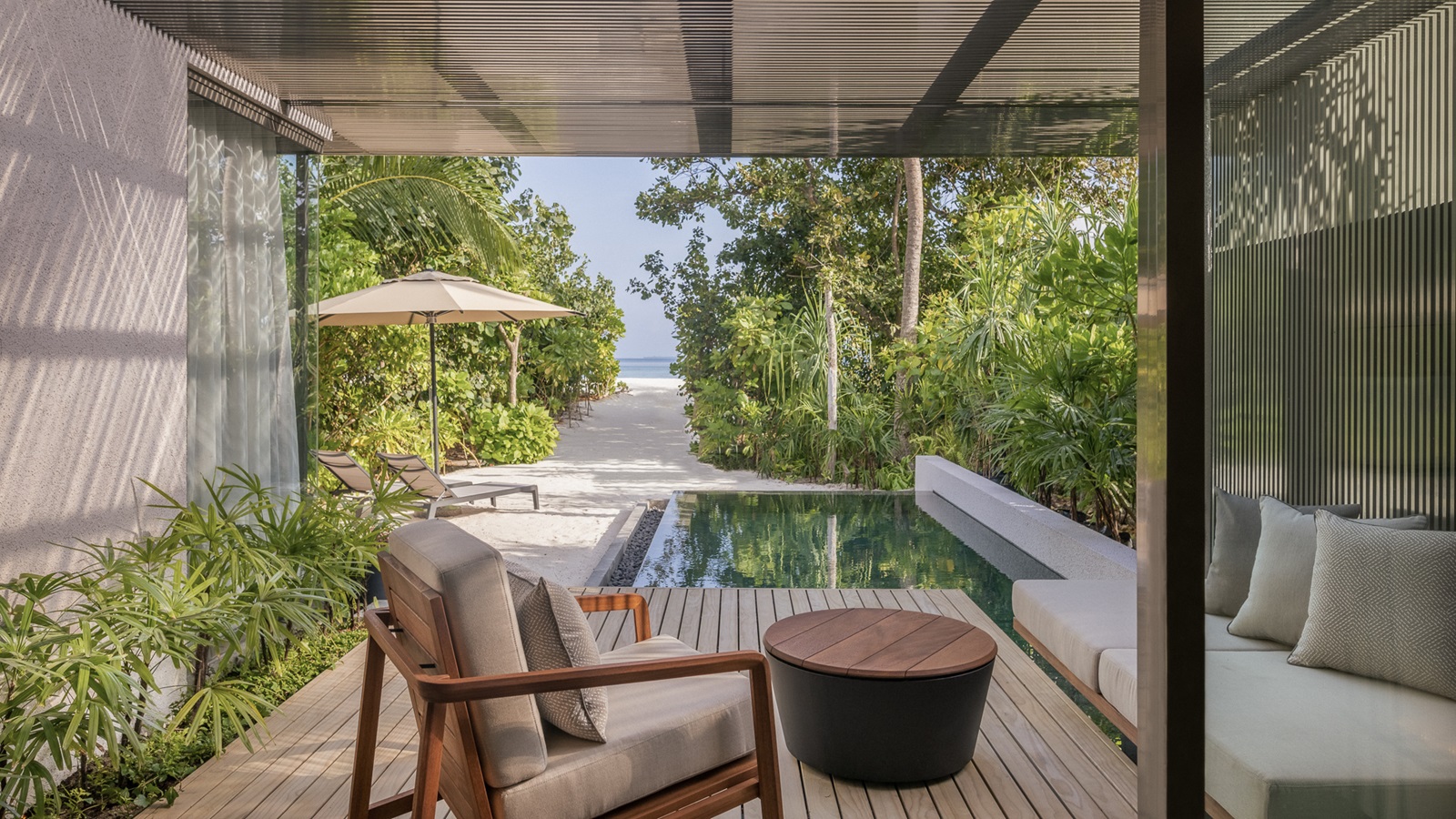beach villas (202 m²) en sunset beach villas (202 m²) met aparte living, slaapkamer en ruime badkamer, deels in openlucht met oversized bad en extra buitendouche en ruim terras omgeven door groen en toegang tot het strand
