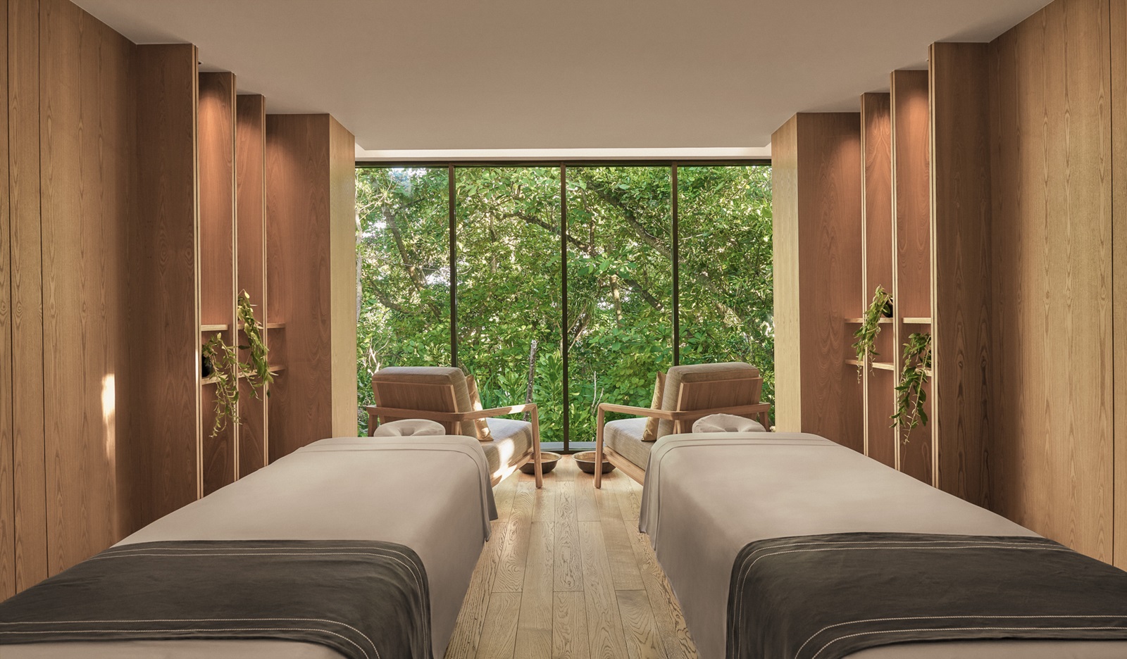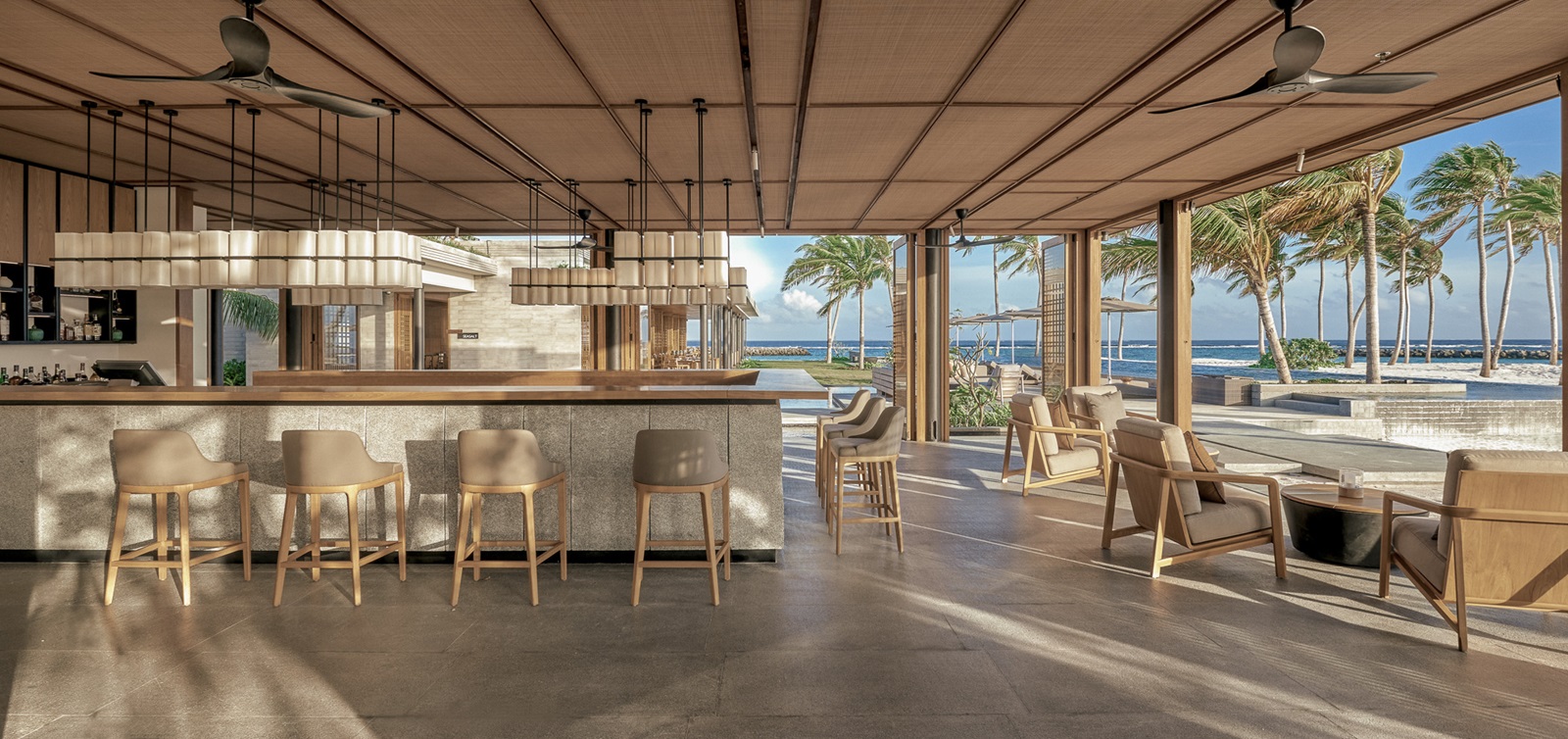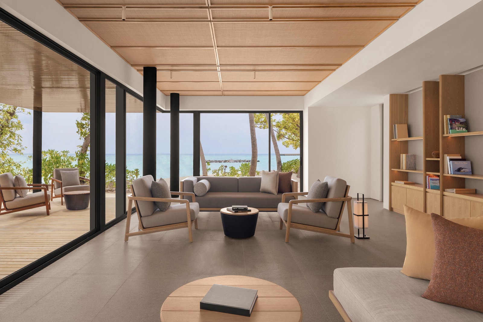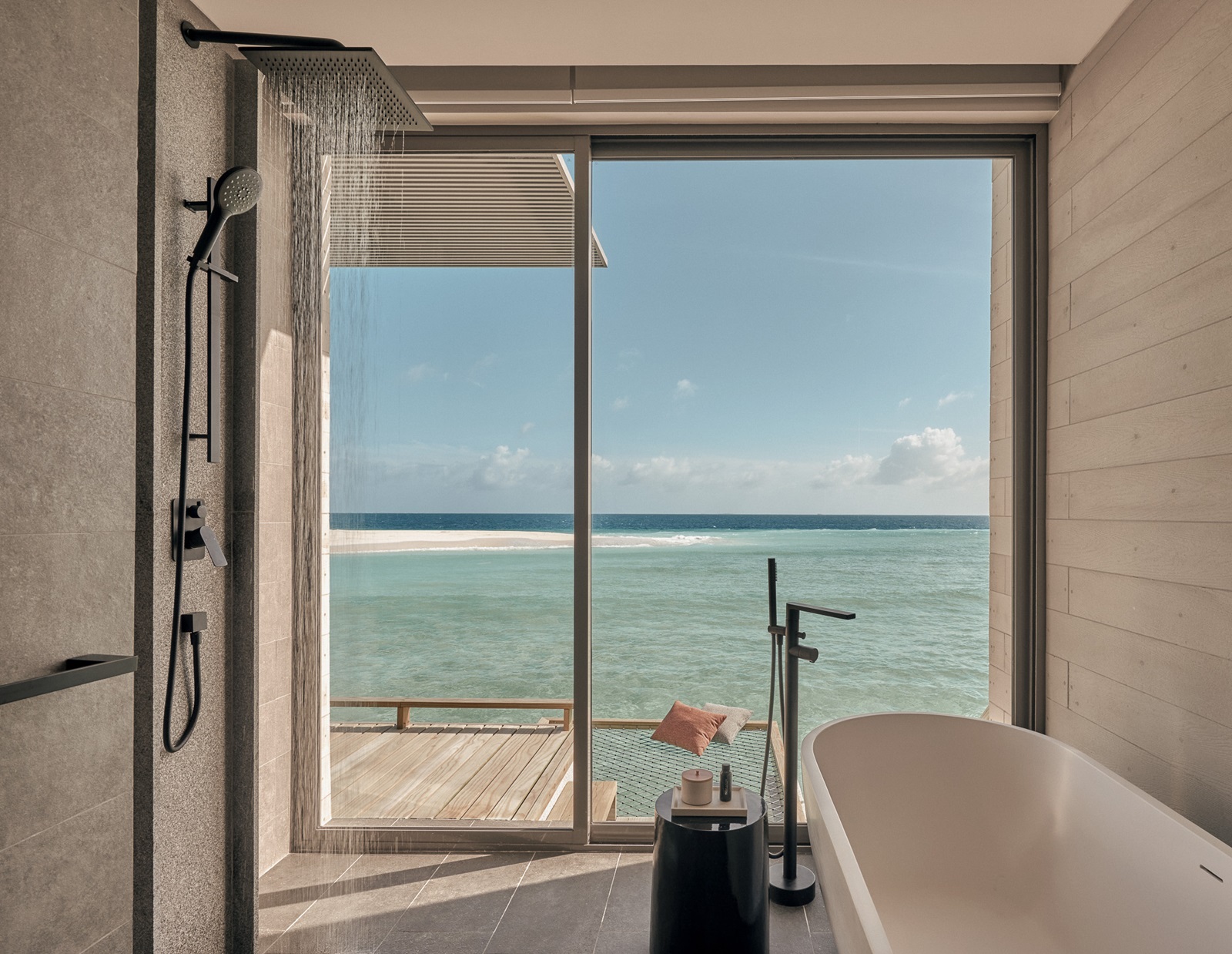 beach villas (202 m²) en sunset beach villas (202 m²) met aparte living, slaapkamer en ruime badkamer, deels in openlucht met oversized bad en extra buitendouche en ruim terras omgeven door groen en toegang tot het strand