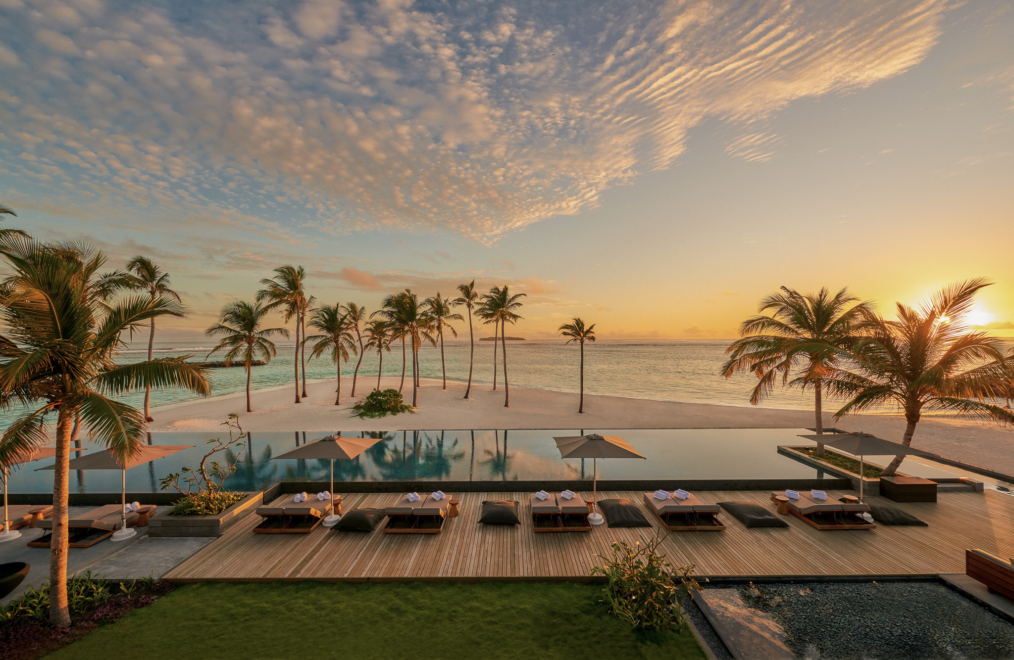 ocean water villas (125 m²), lagoon water villas (125 m²) en sunset water villas (125 m²) met geintegreerde zithoek en mooi terras met dagbed en toegang tot de lagune
