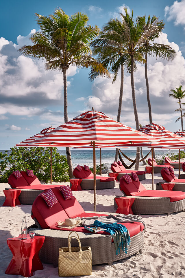 gratis ligbedden, parasols en handdoeken aan zwembad en strand