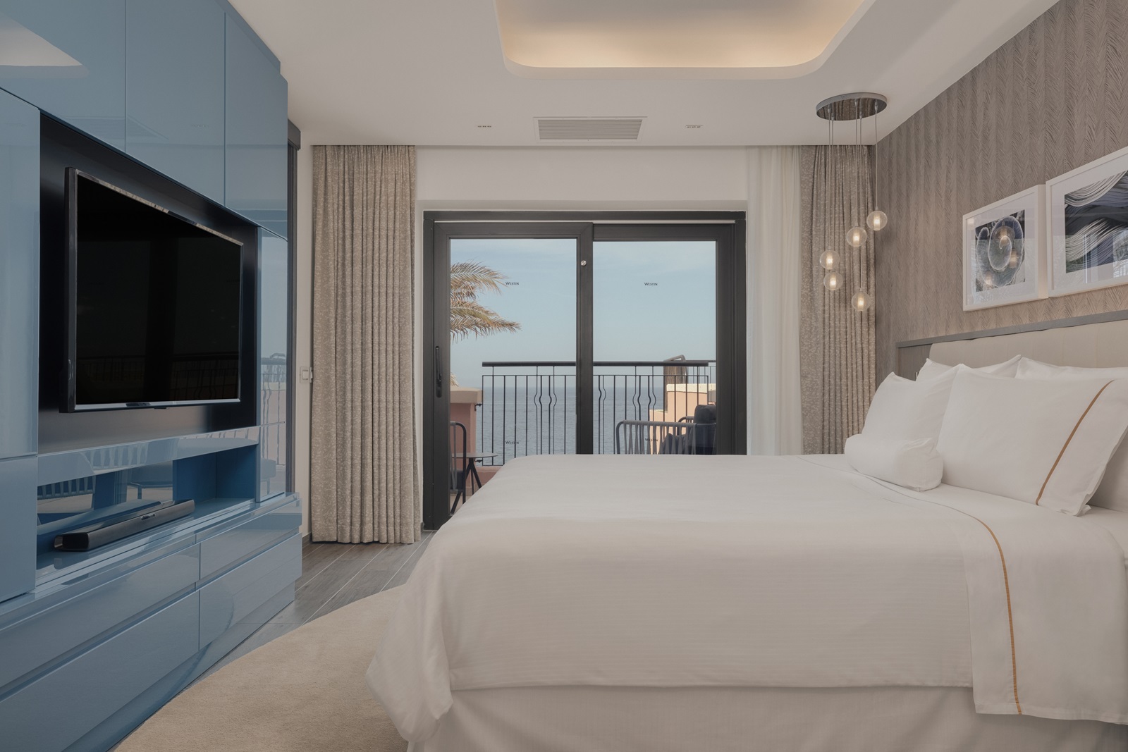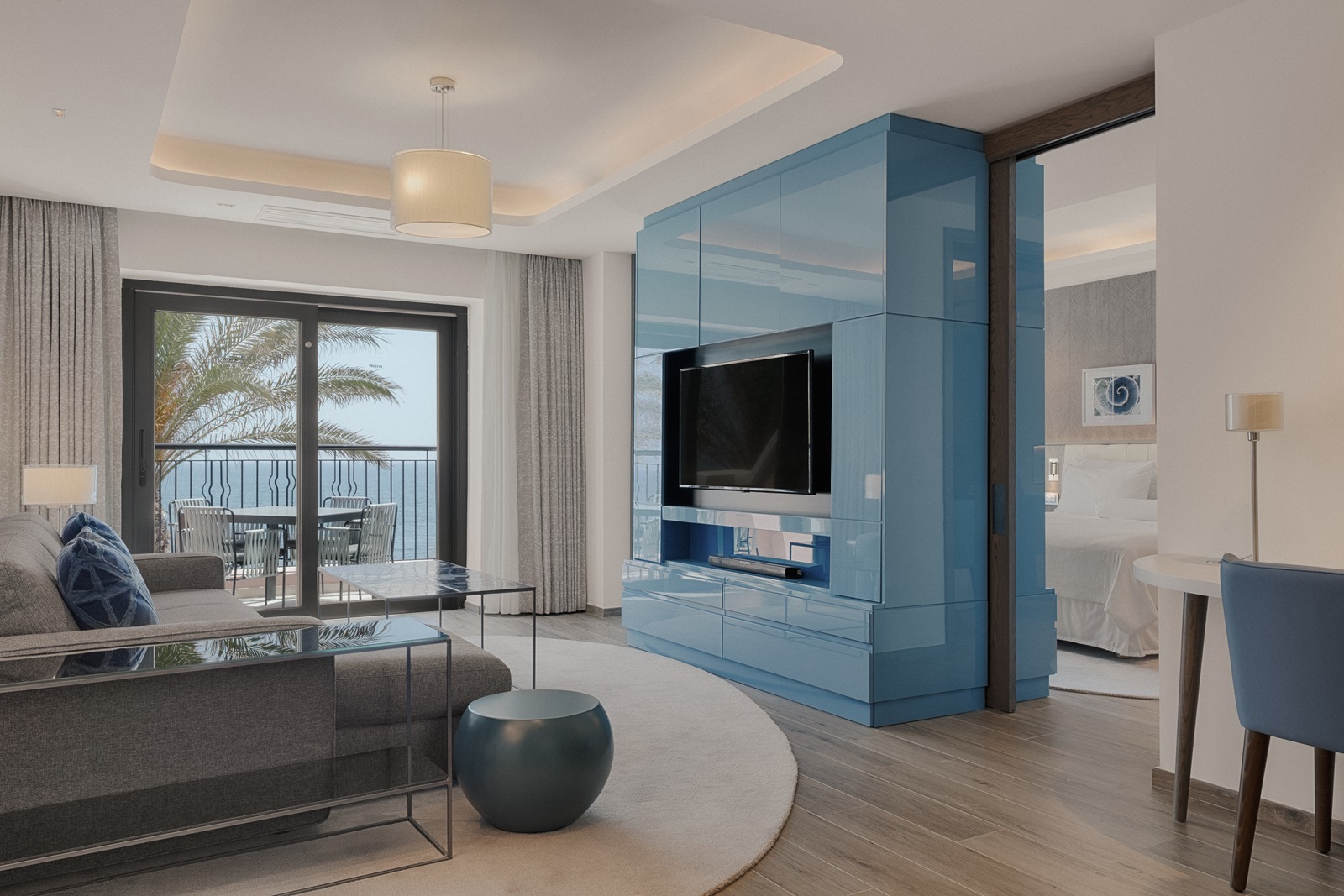 Luxury Bay suites (90 m²) met woonkamer met sofabed, kitchenette, aparte slaapkamer, 2 badkamers en ruim balkon met zeezicht