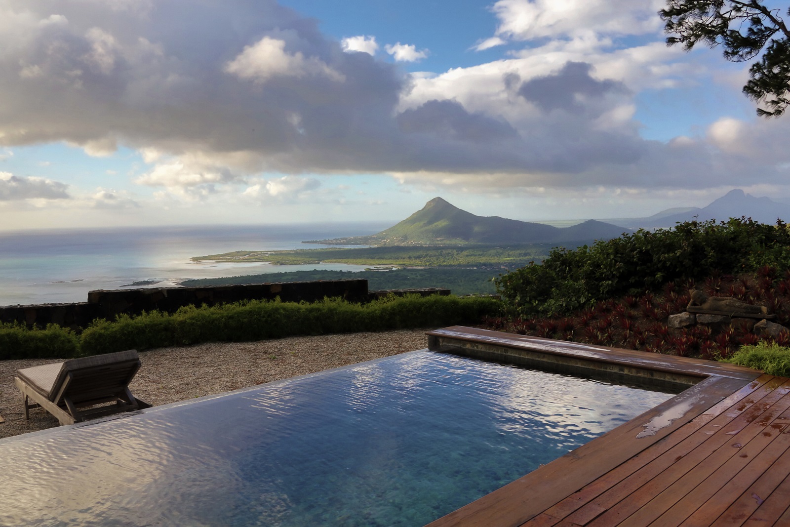 Sea View Pool Suite (ca. 100 m²) met aparte slaapkamer en woonkamer, terras met privézwembad, zeezicht richting Le Morne en openlucht douche.