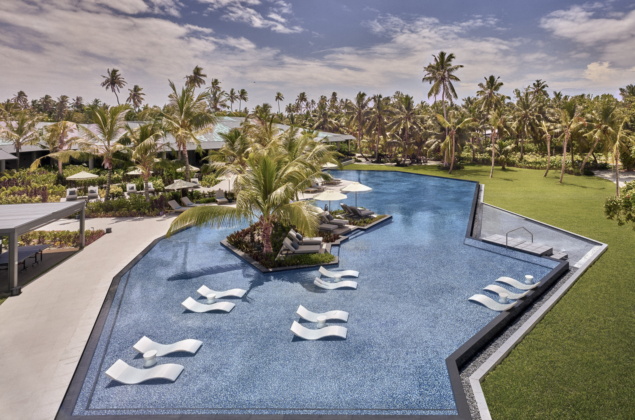 Blacktip Pool Villa (393 m²) met ruime woonkamer, aparte slaapkamer met kingsize bed, tweede slaapkamer met twin bedden, groot terras met privézwembad en directe toegang tot het strand