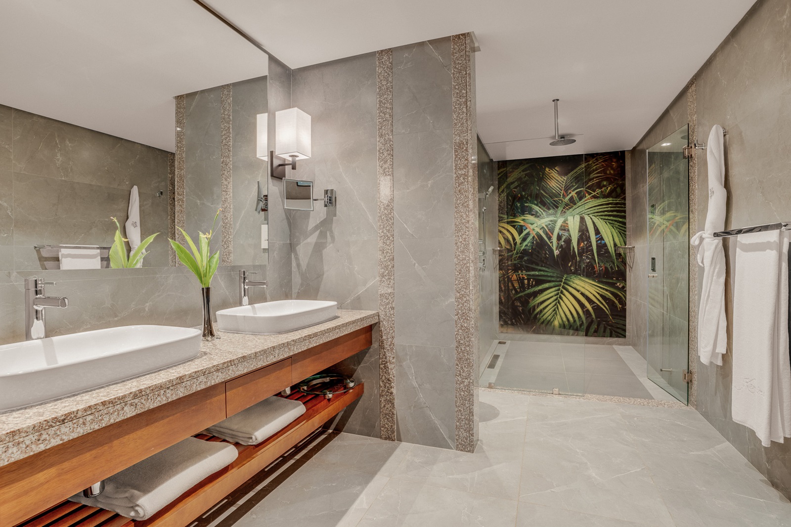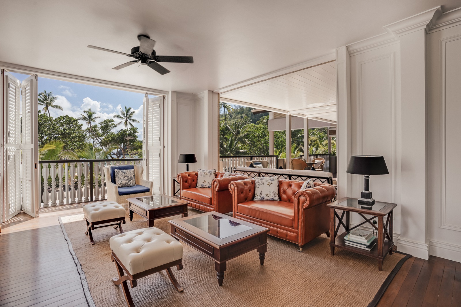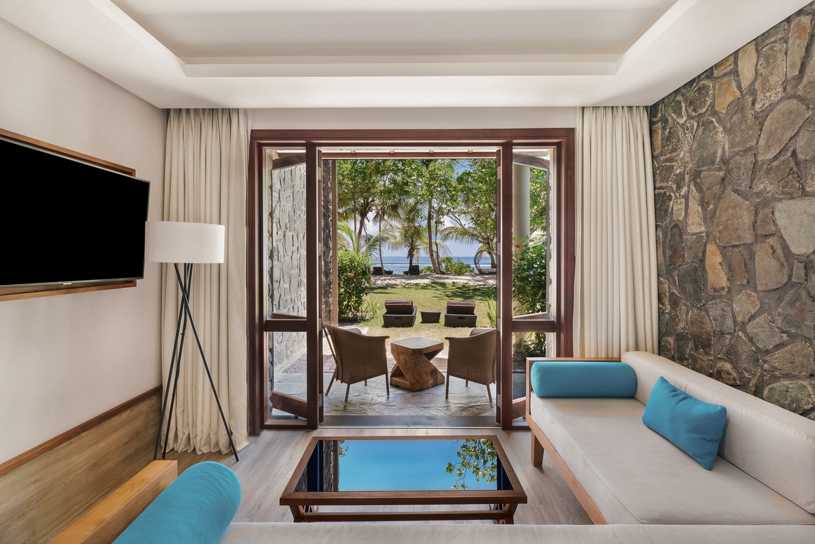 Deluxe Lagoon View Suites (93-96m²) met ruime woonkamer, aparte slaapkamer, ruimere badkamer met bad en douche, balkon of terras met ligbedden en zicht op de lagune
