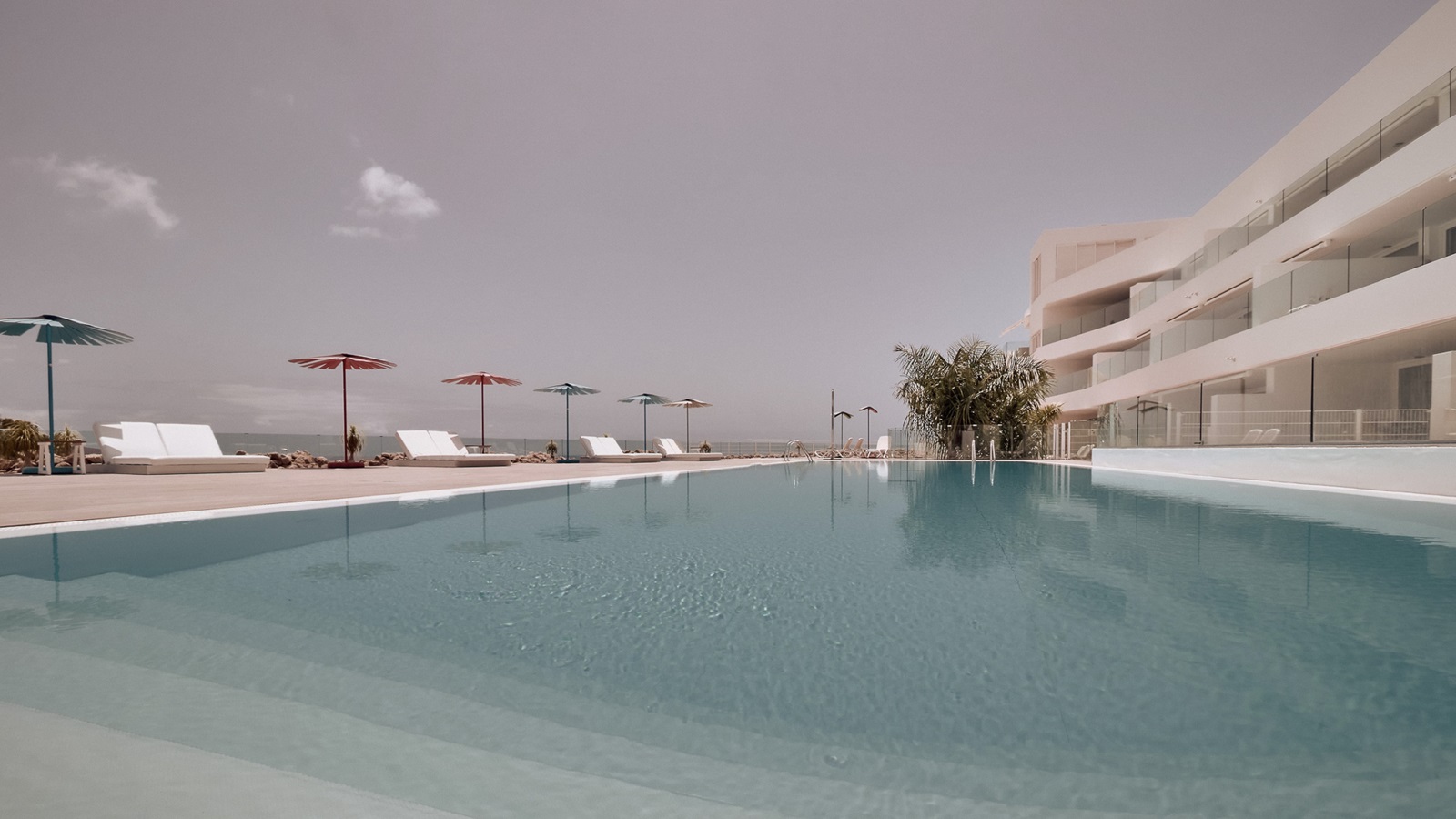 ligbedden, parasols en handdoeken aan het zwembad