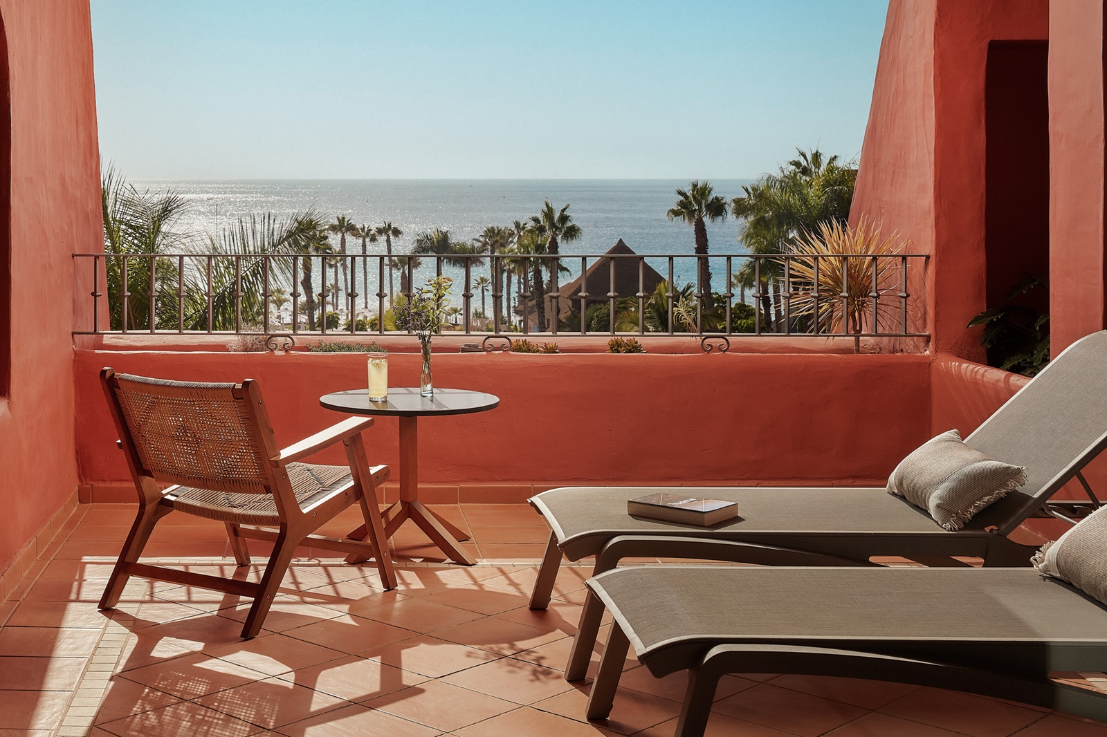 Premium Terrace kamers (62 m²) gelegen op de bovenste verdiepingen met ruim balkon met ligbedden en zeezicht