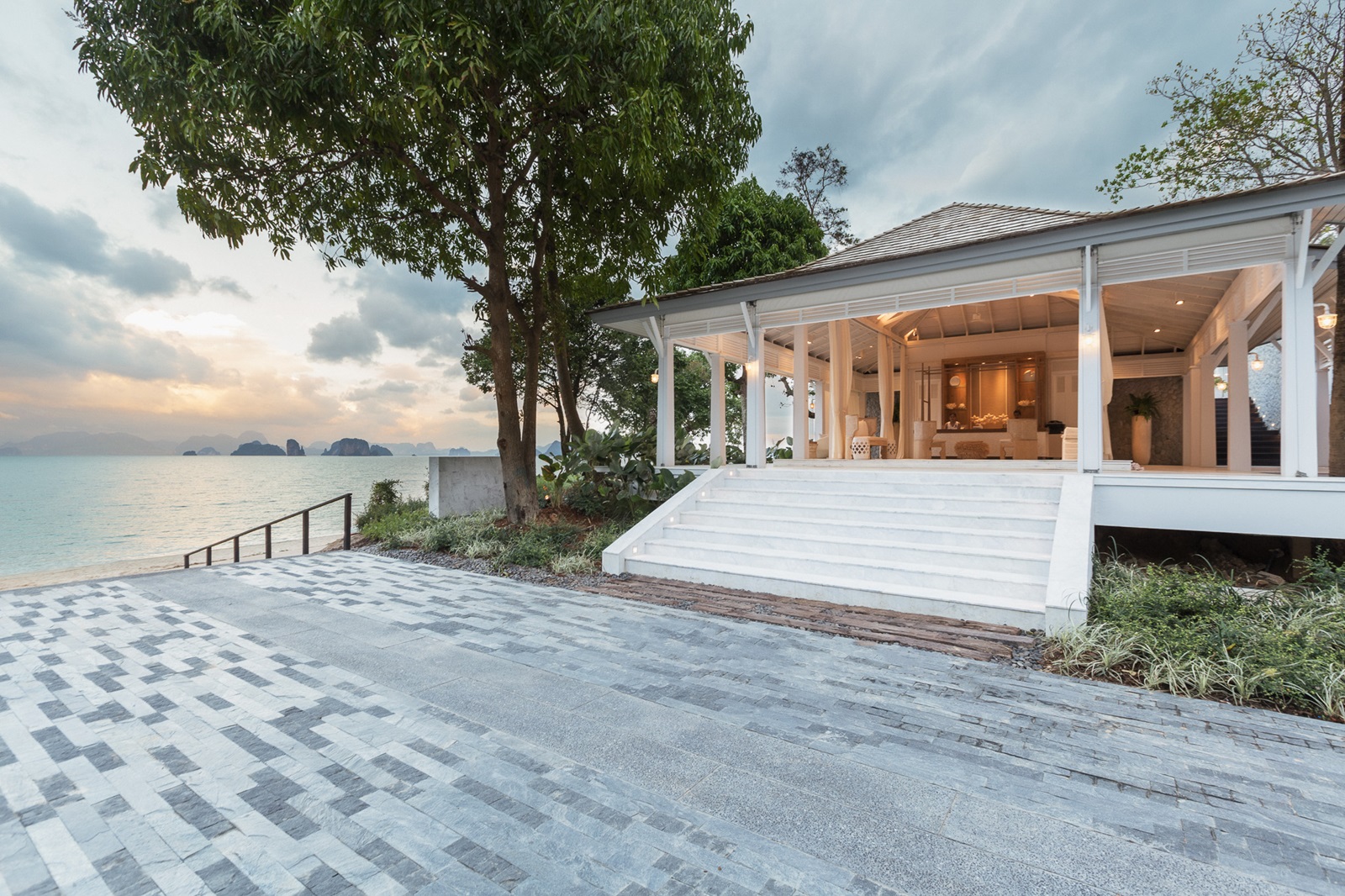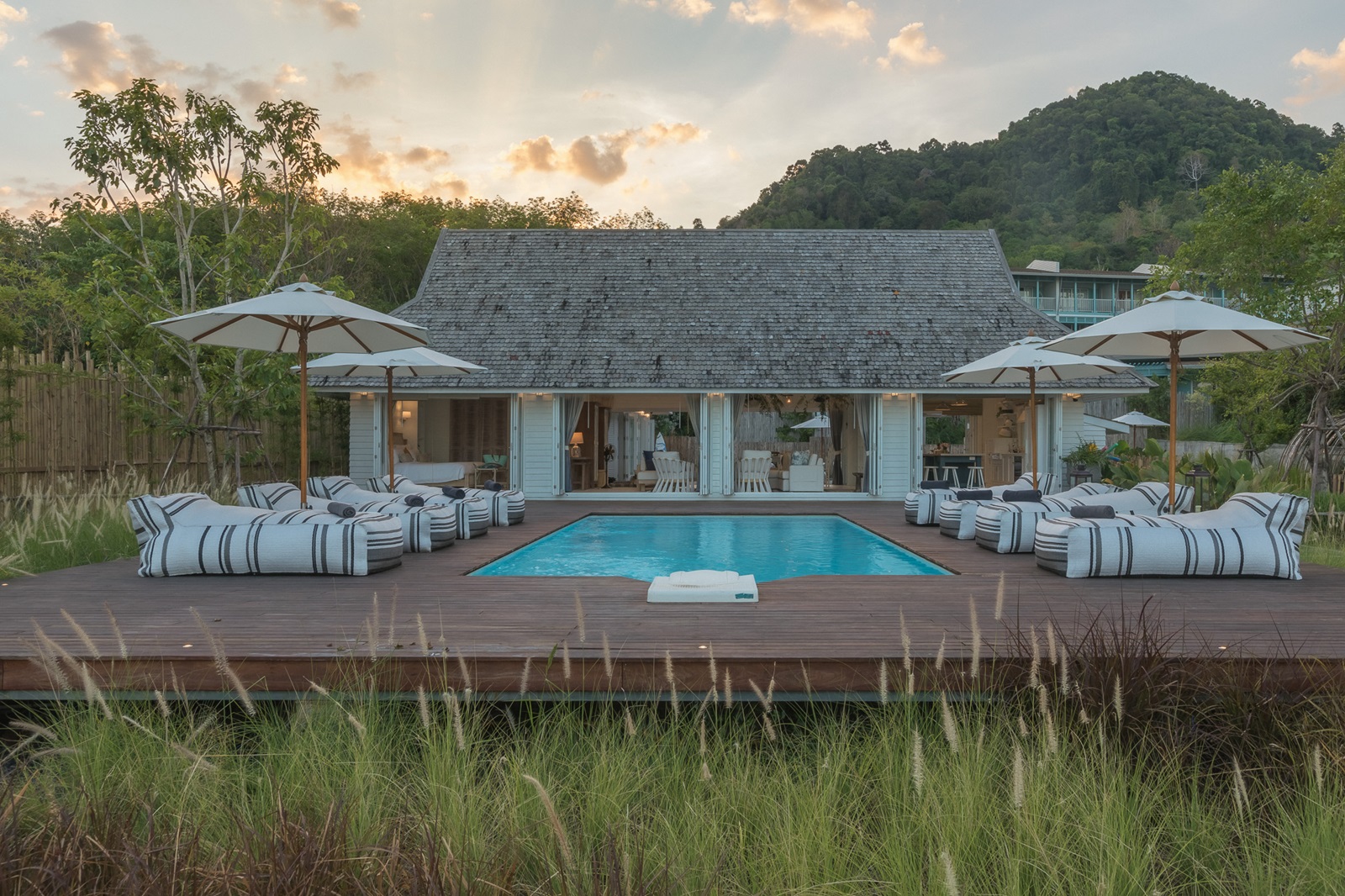 Baan Yu Yen (1.315 m²) met 2 slaapkamers, 2 ensuite badkamers, 2 privézwembaden, open terras, ruime woonkamer en volledig uitgeruste keuken; gelegen op korte wandelafstand van het strand en met panoramisch zeezicht op Phang Nga Bay