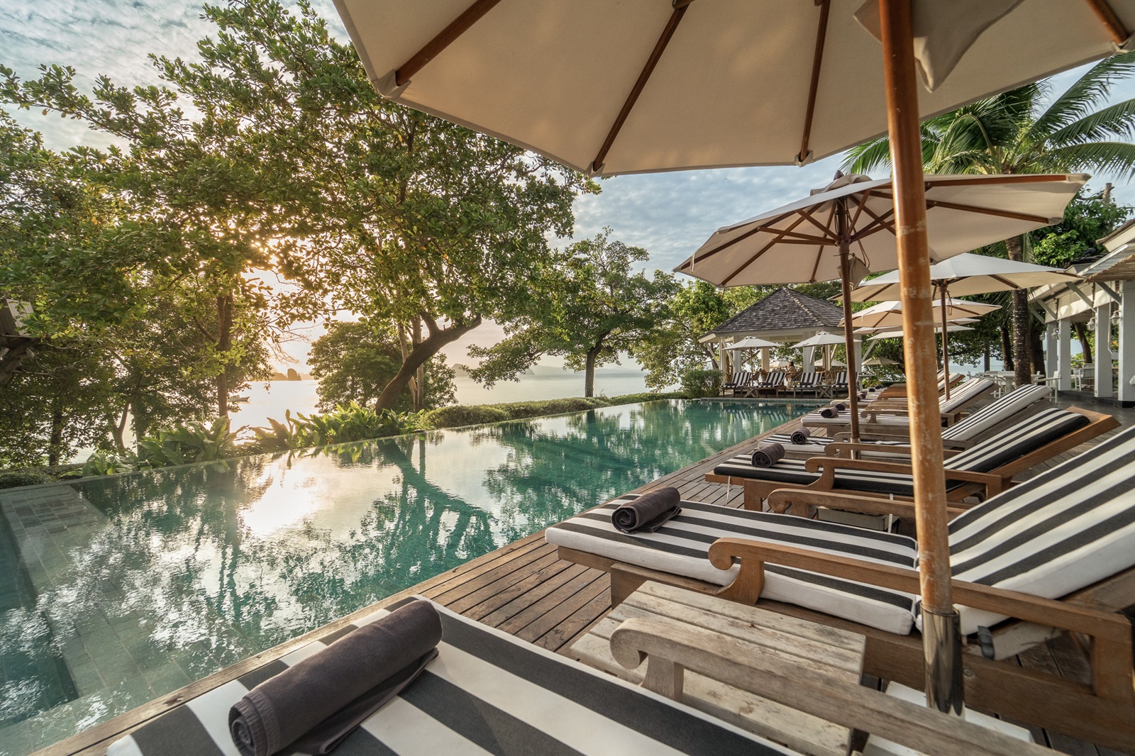 infinityzwembad met uitzicht op de eilanden en extra cabana’s