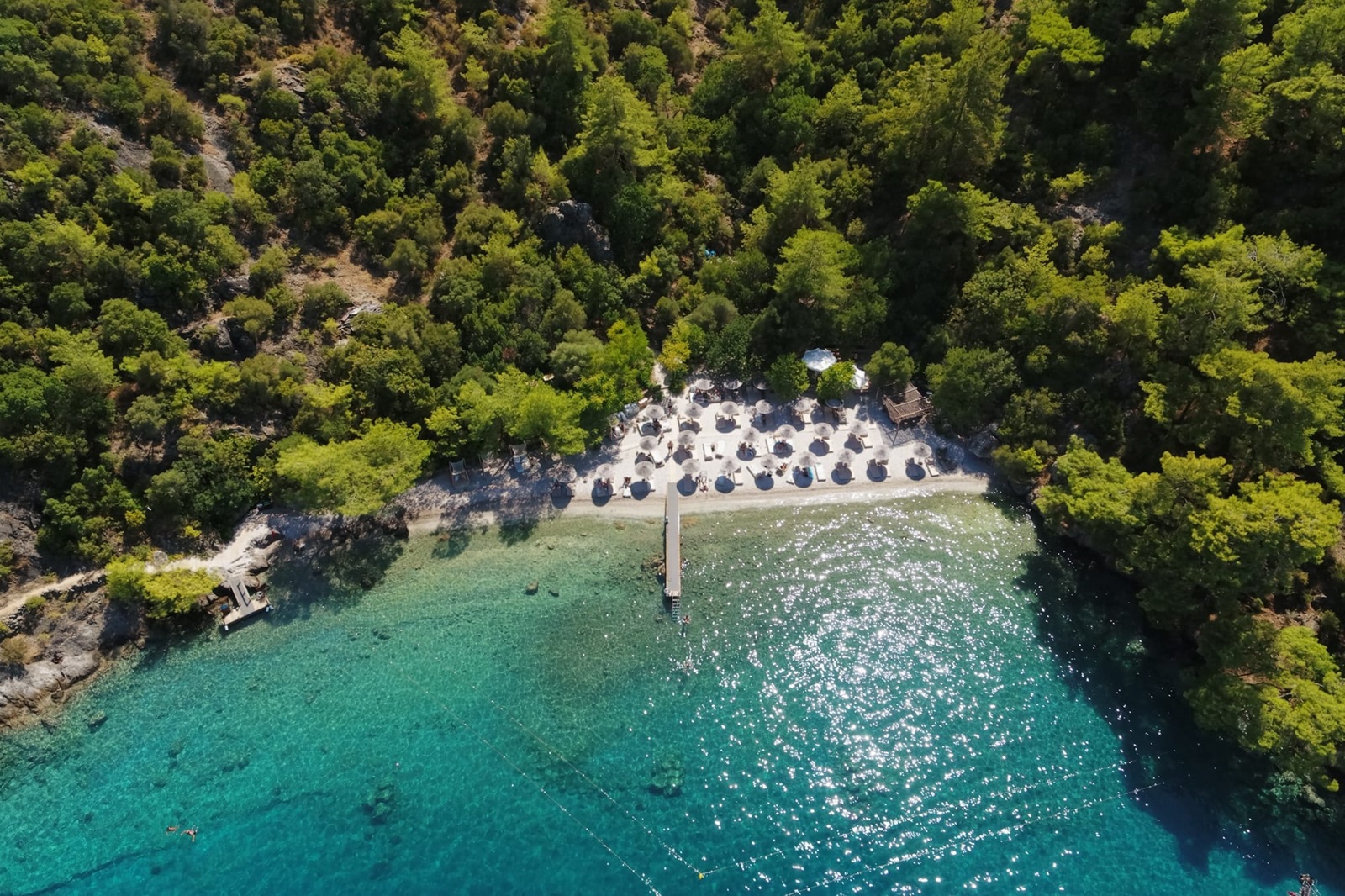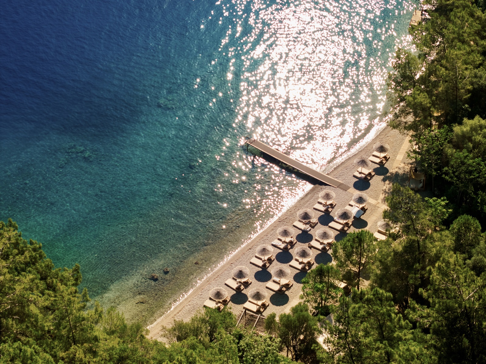 het paradijselijke en rustige ‘Serenity Beach’ (adults only, 65 m) te bereiken via het dennenbos (ook te bereiken per boot) met ‘Serentiy Bar’