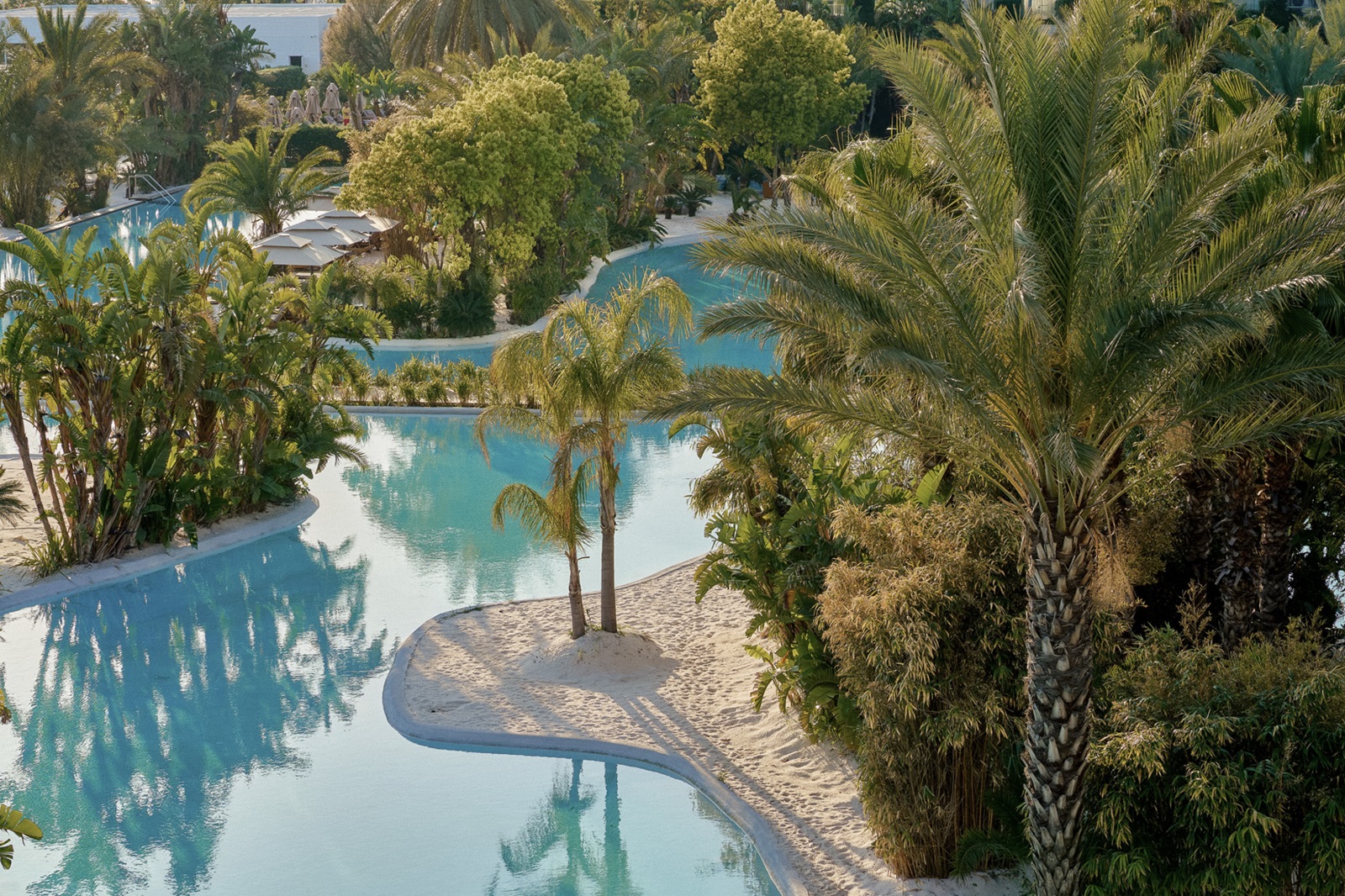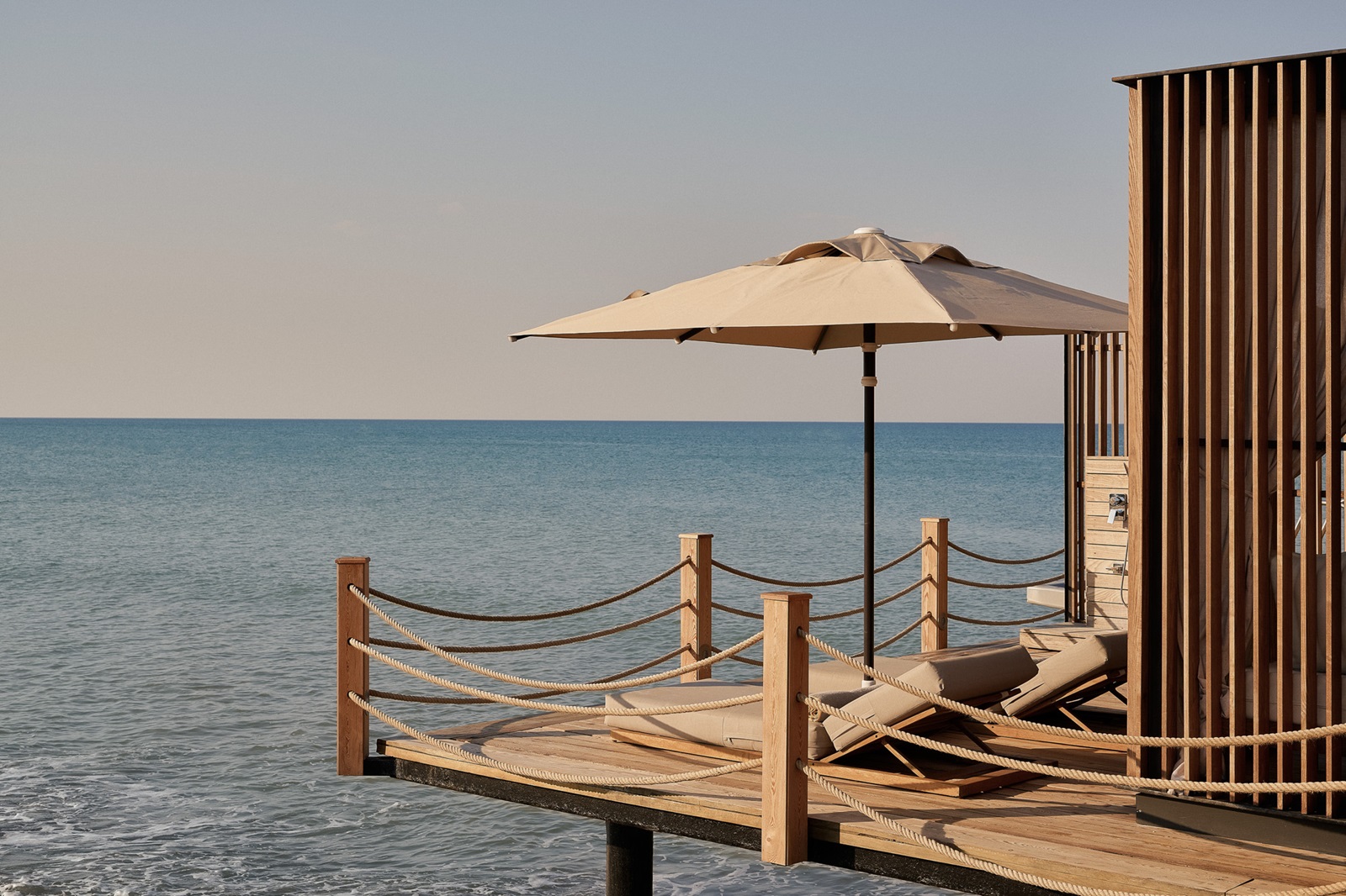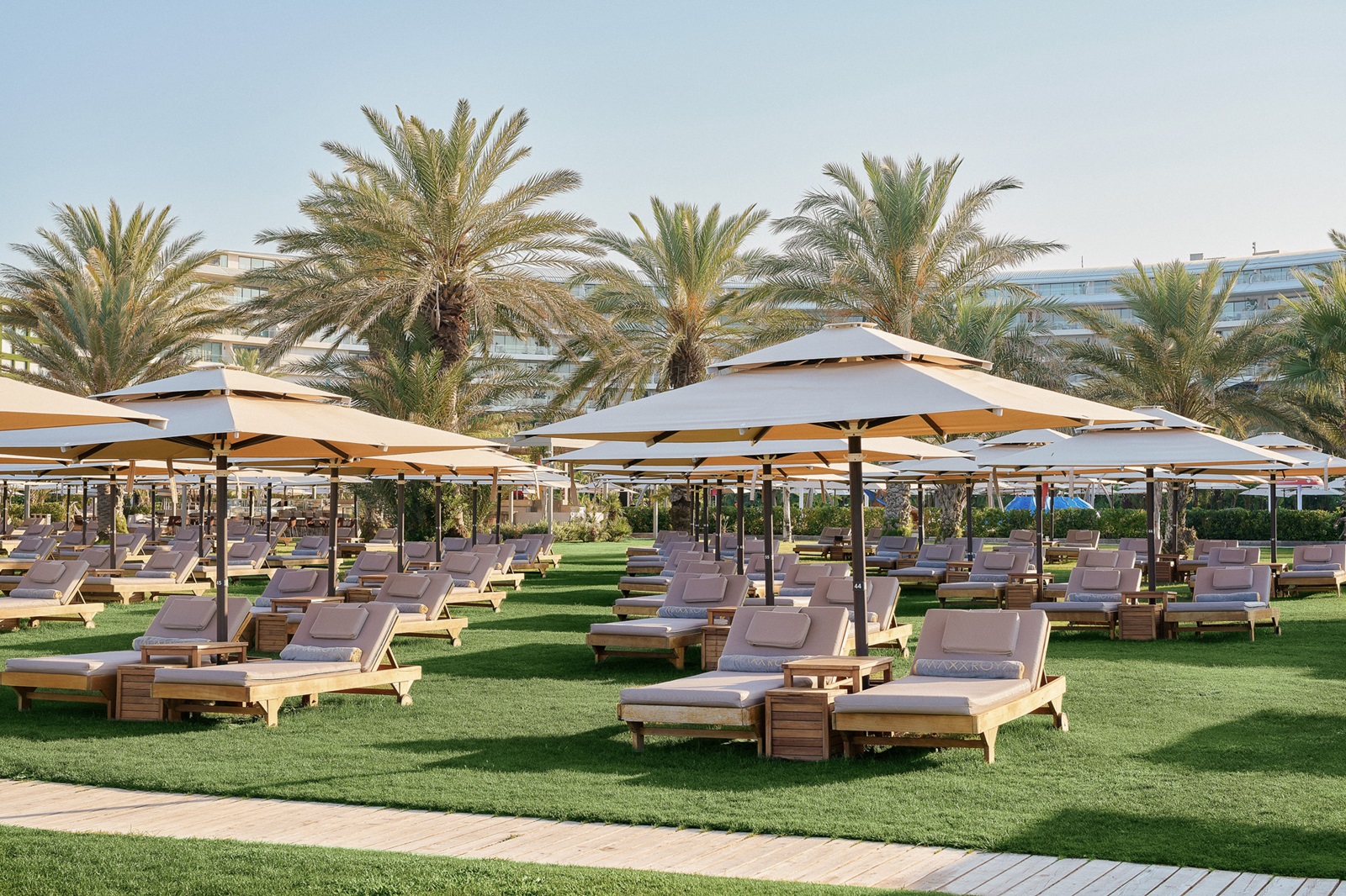 ligbedden, parasols en handdoeken aan het zwembad en aan het strand