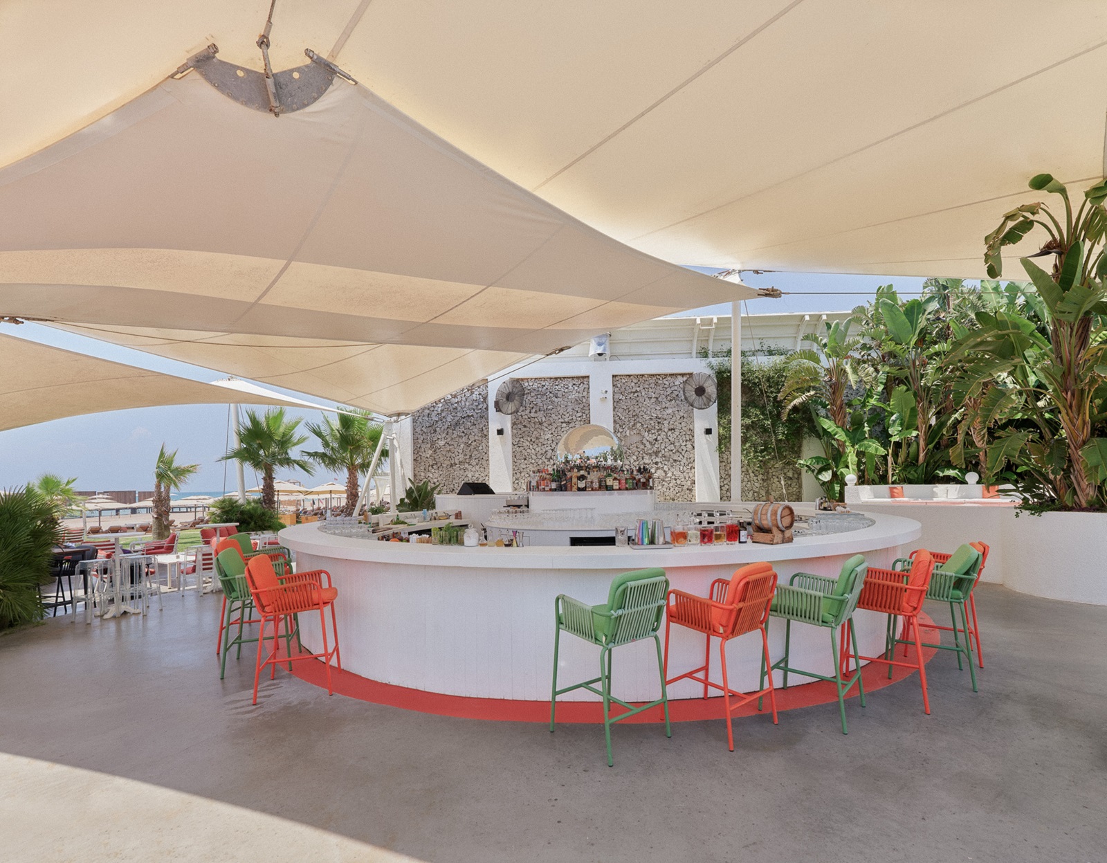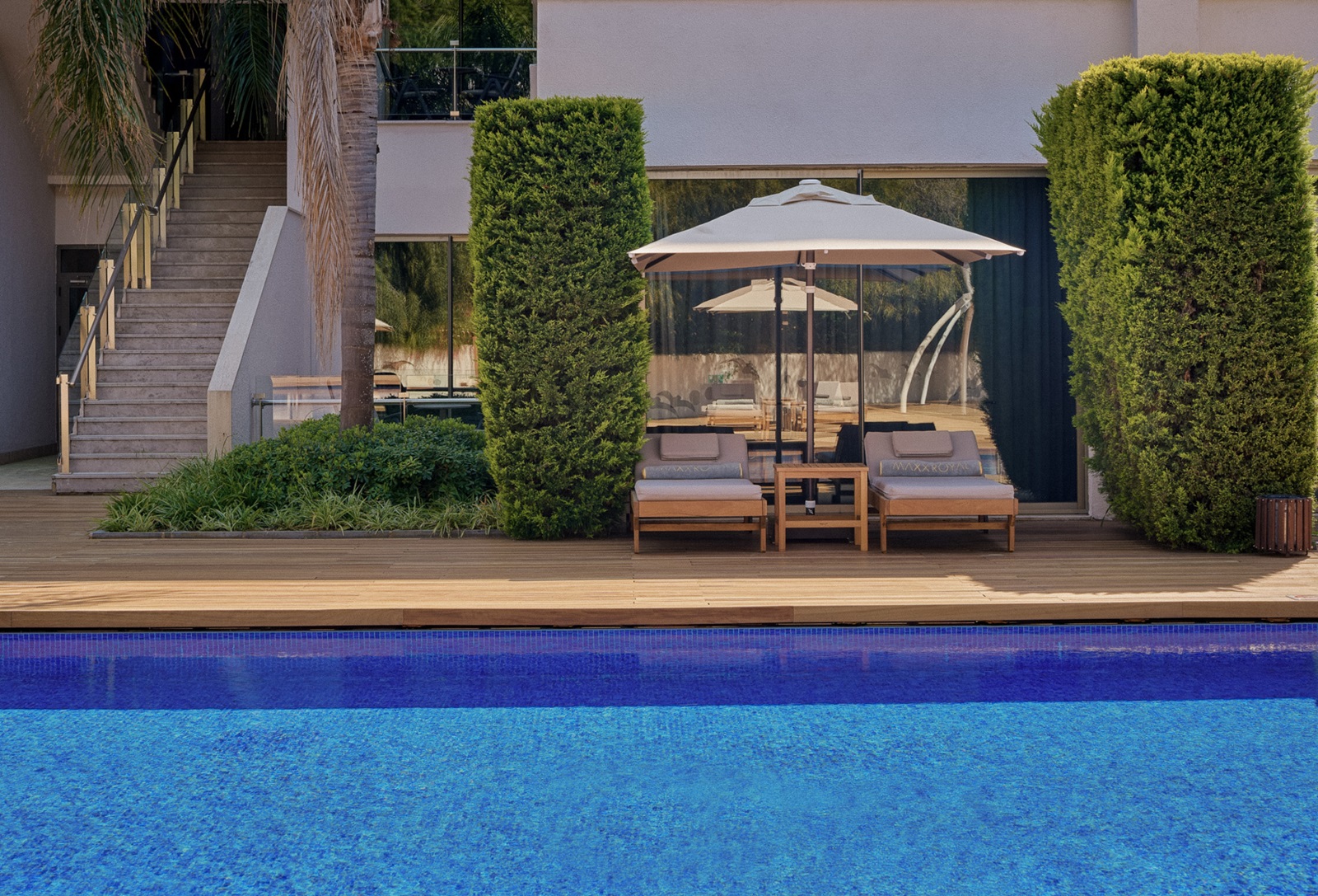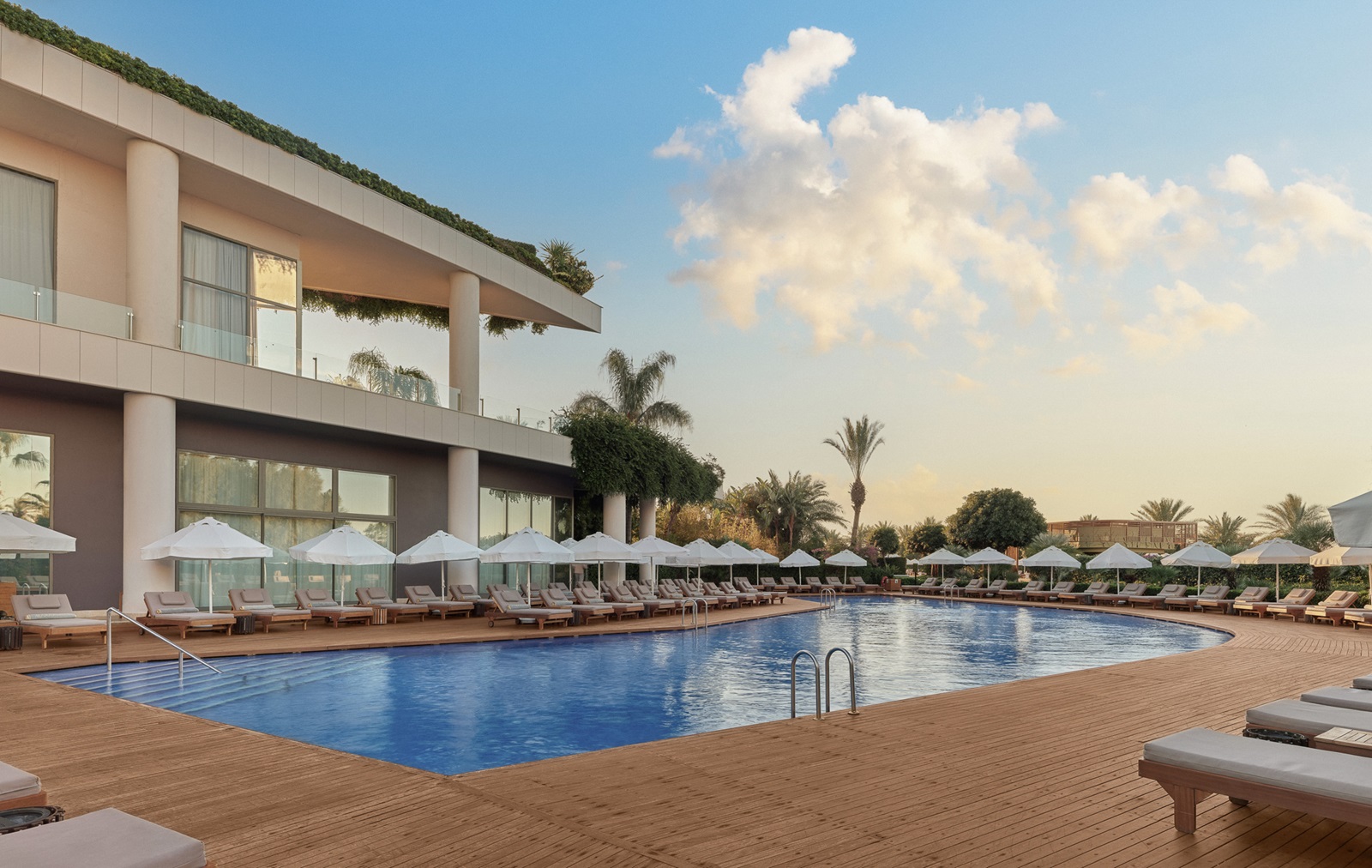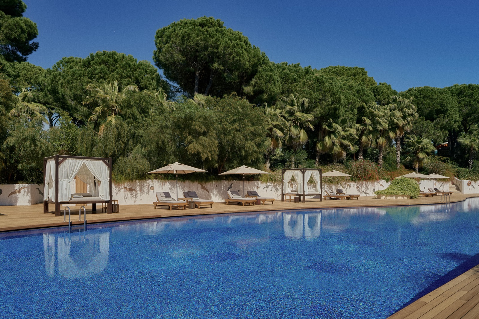 ligbedden, parasols en handdoeken aan het zwembad en aan het strand