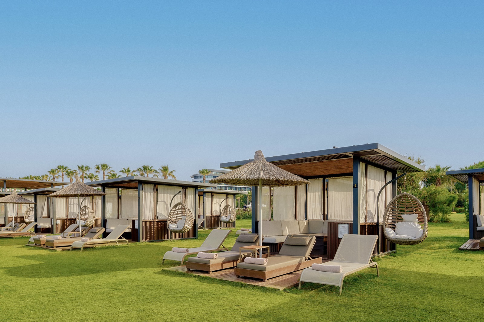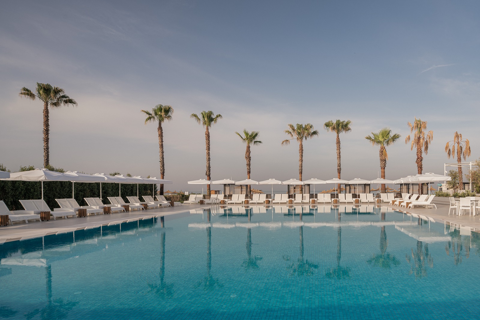 ligbedden, parasols, matrasjes en handdoeken aan het zwembad en aan het strand