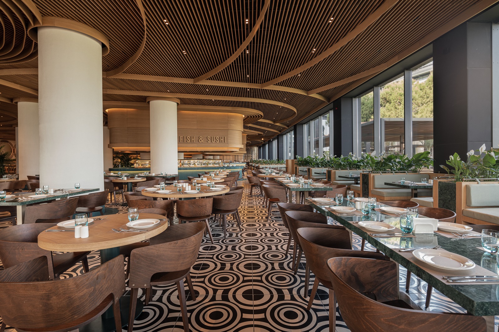 7 à-la-carterestaurants (€) : internationaal, Turks, Italiaans, Chinees, teppanyaki, Mexicaans en steak house