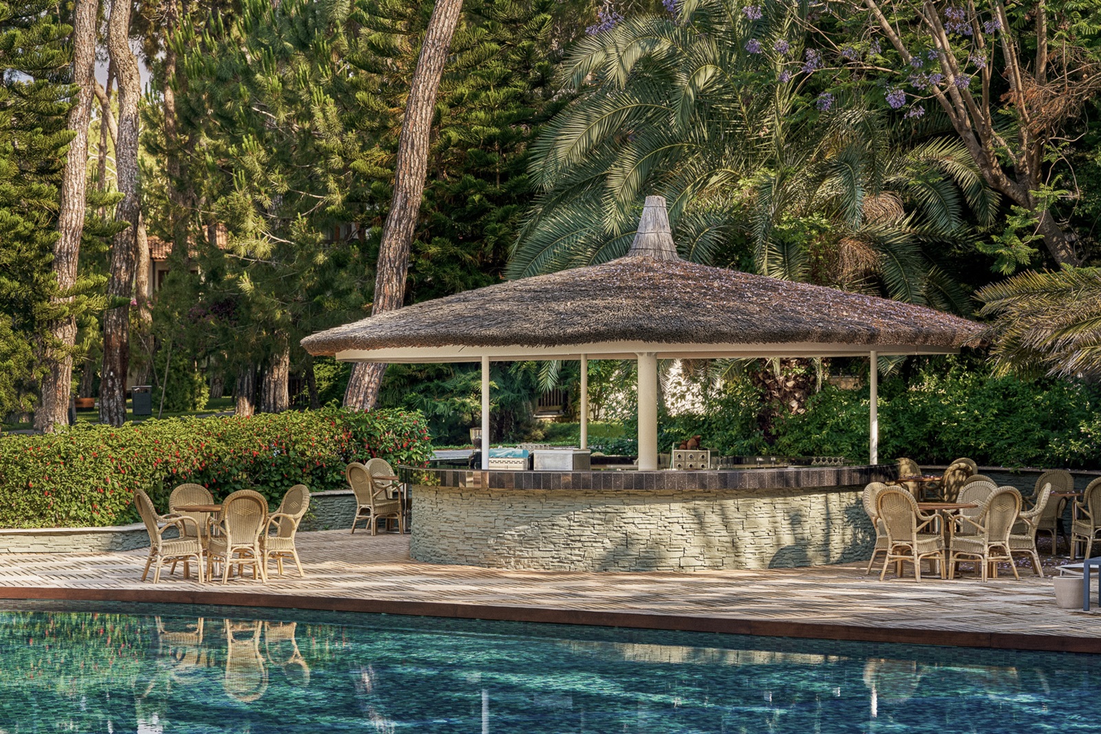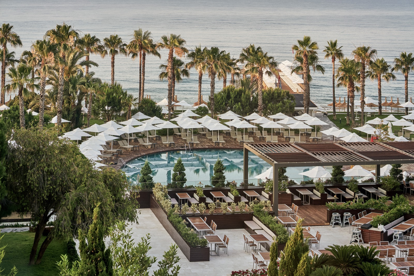 ligbedden, parasols en handdoeken aan het zwembad en aan het strand